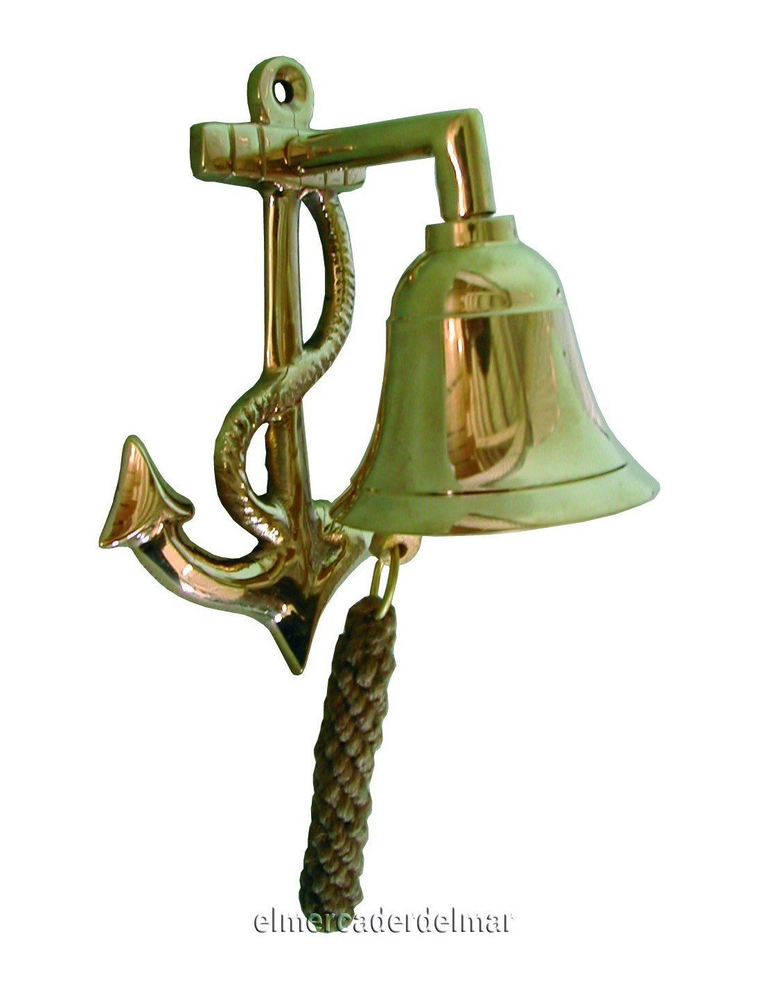 Miniatura marinera de campana de barco con ancla y rabiza de cabo de cáñamo elaborada artesanalmente en latón pulido.