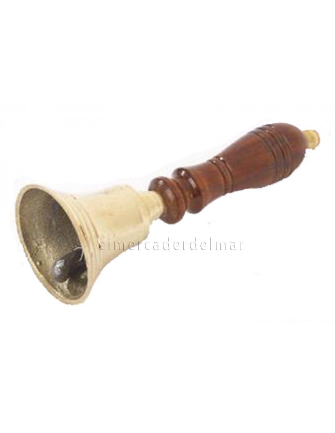 Campana náutica de latón o bronce bajo pulida brillante y mango de madera.