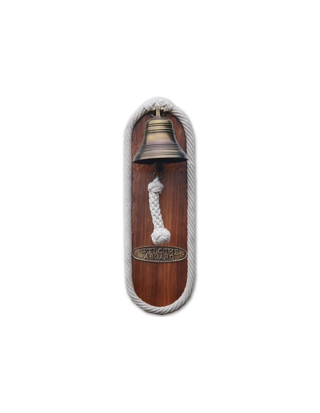 Plafón náutico de madera maciza ovalado y cabo trenzado con nudo marinero de cadenilla alrededor, con campana náutica metálica envejecida y rabiza elaborada en cabo de algodón.
