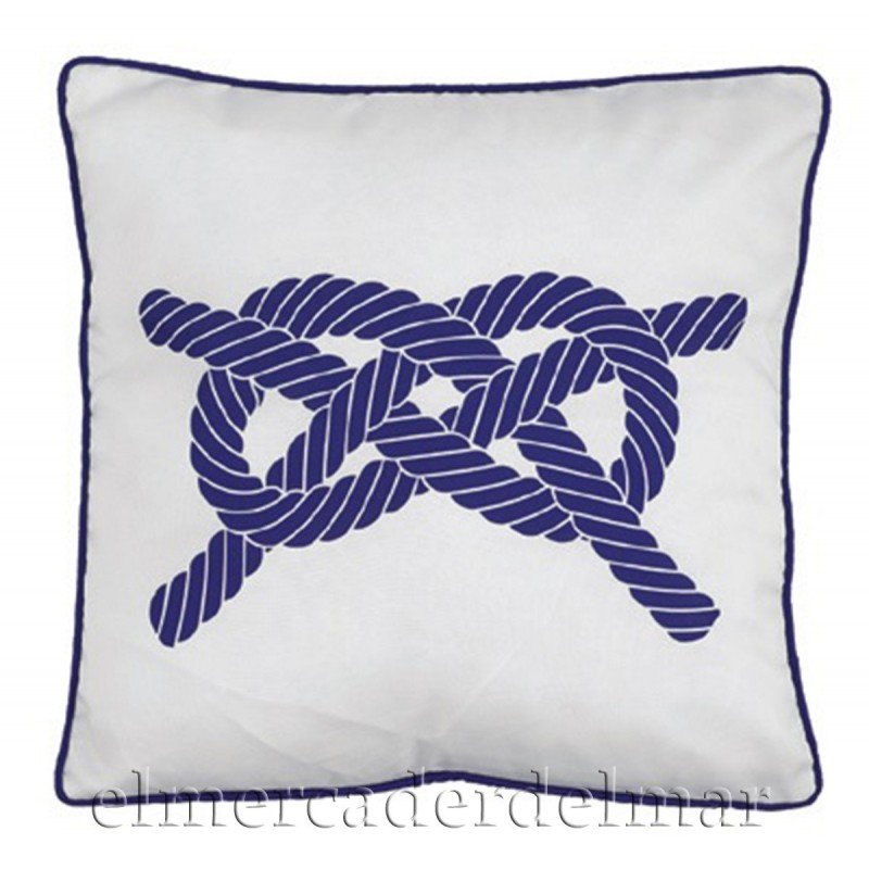 Cojín náutico de algodón con relleno incluido. Ribeteado en azul y con motivo de nudo marinero. Decoración en ambientes marineros de playa o terrazas y habitaciones infantiles.