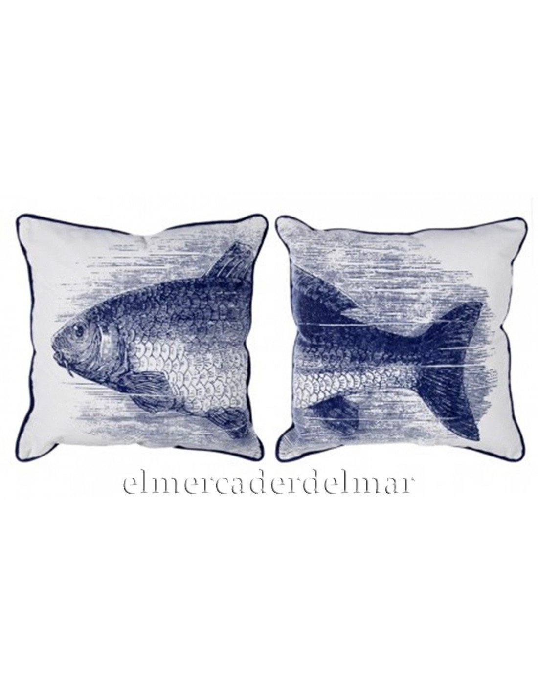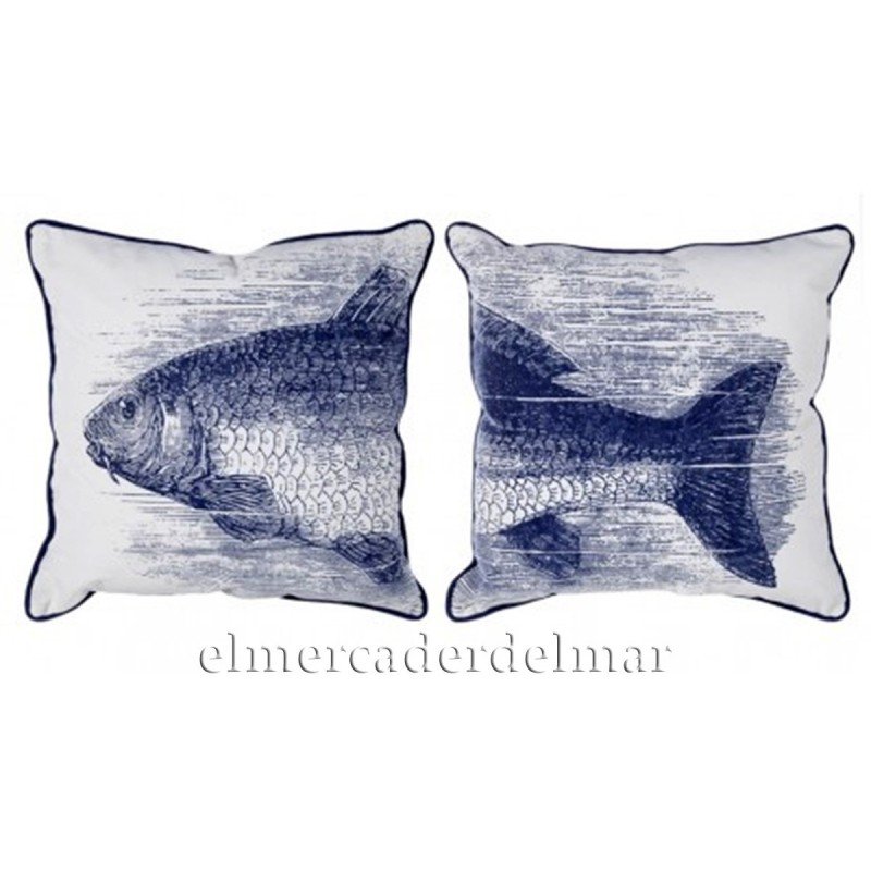 Set de dos cojines náuticos de color blanco con ilustración de pez y ribete en azul marino. Desenfundables y con relleno incluido.