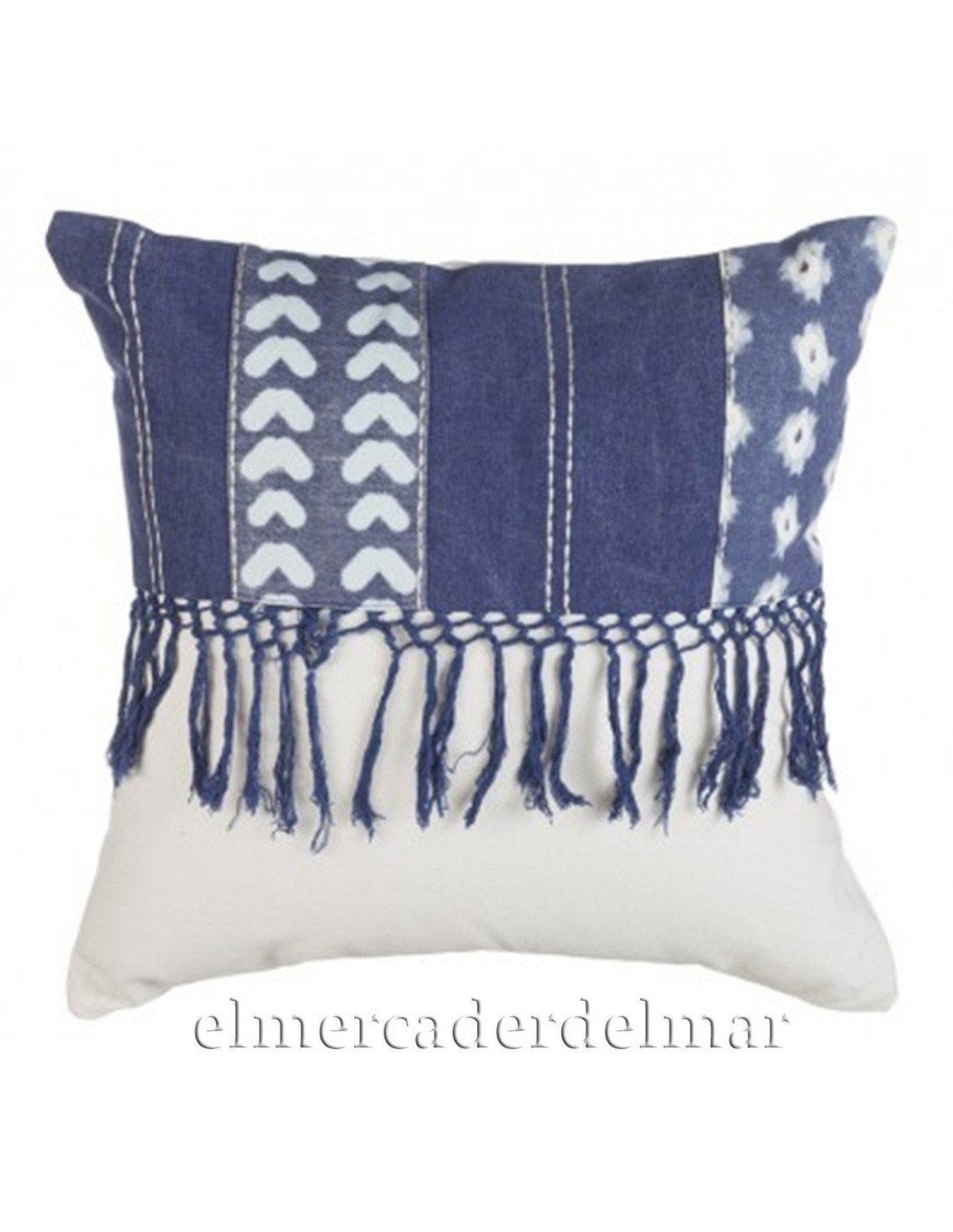 Cojín marinero de estilo “boho” fabricado en algodón combinando telas de colores marinos, estampación étnica y flecos. Desenfundables y con relleno de poliéster incluido.