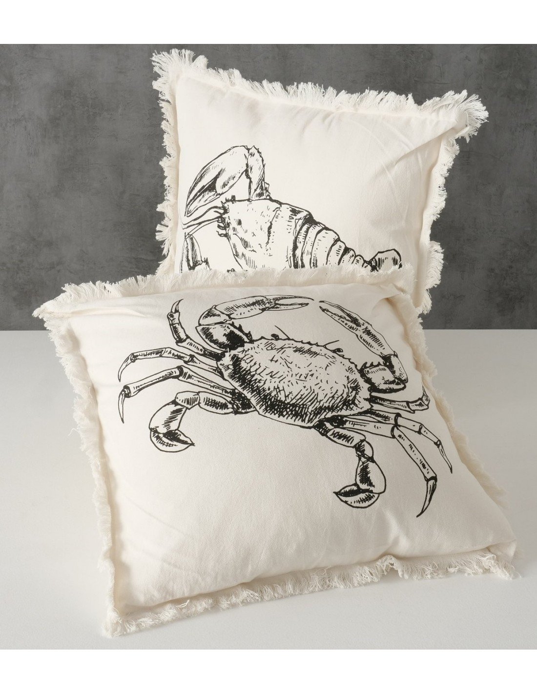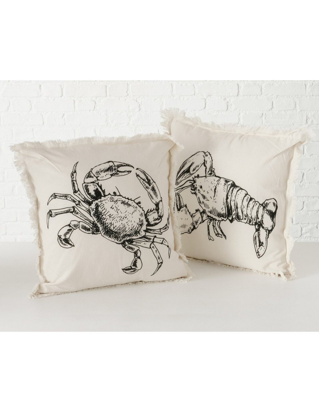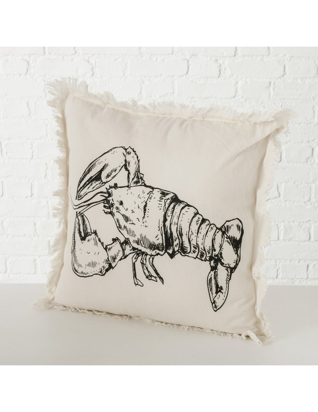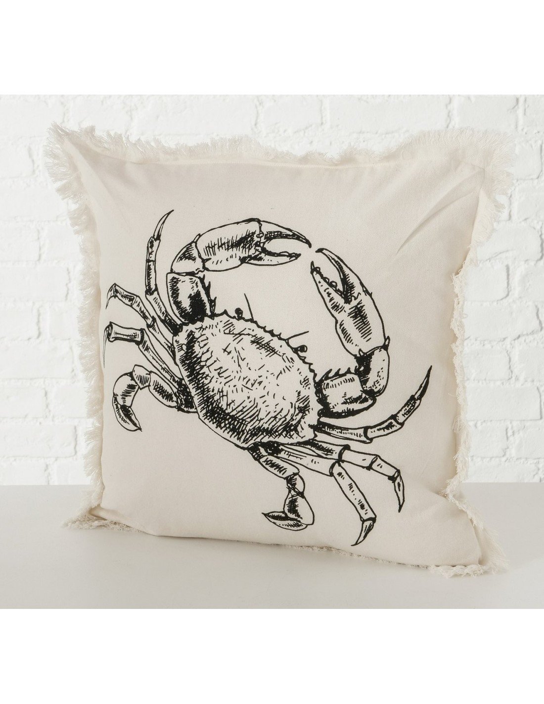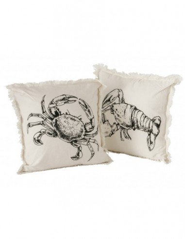 Cojín marino elaborado manualmente en material de algodón con acabados perfectos en los bordes del producto que están acompañado de flecos. La funda tiene un color crema y viene con un estampado de cangrejo/langosta de color negro que brinda un ambiente marino en el hogar.