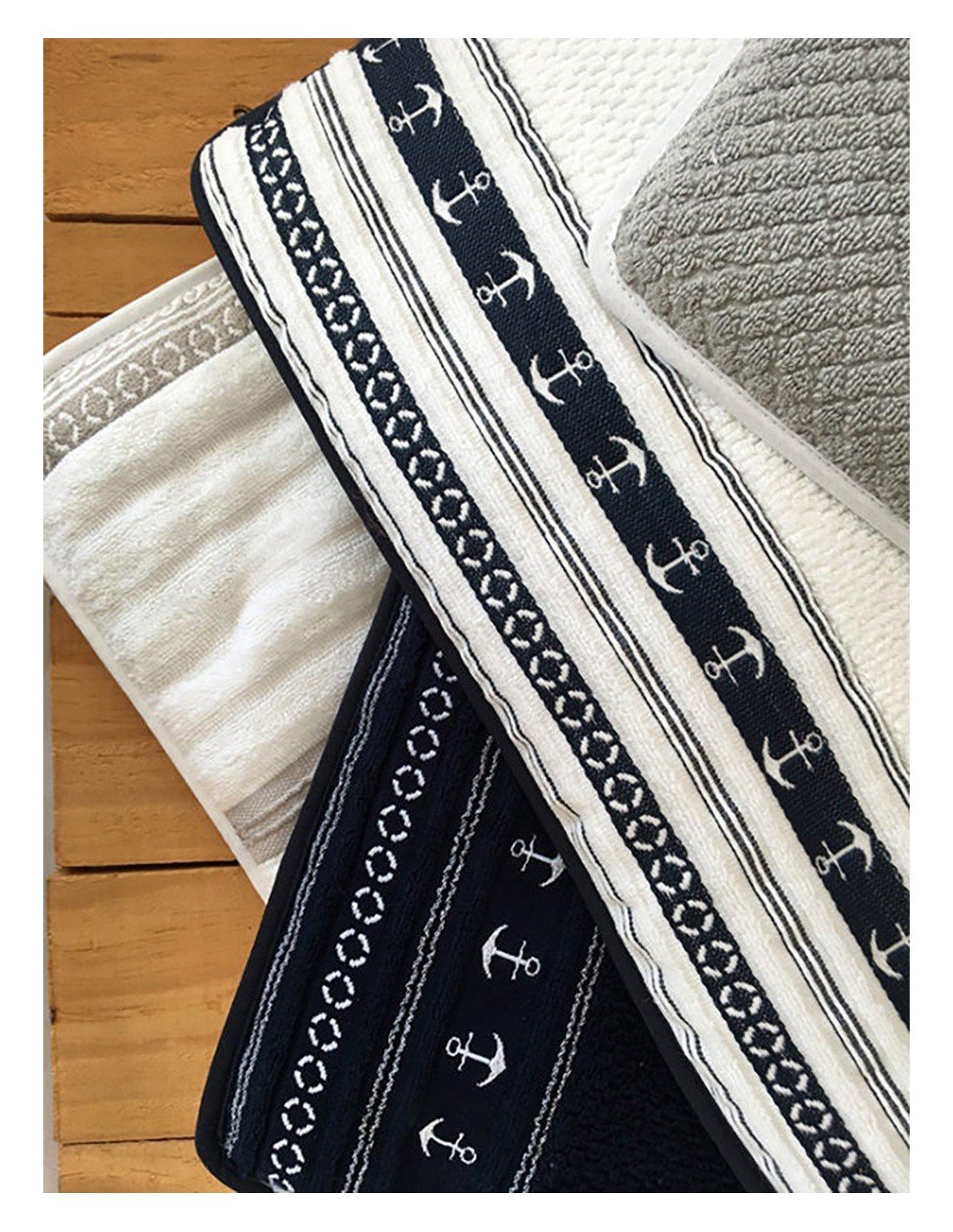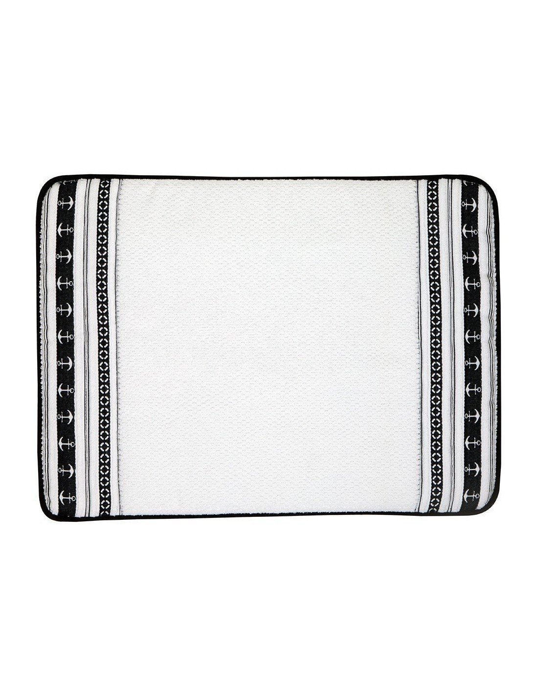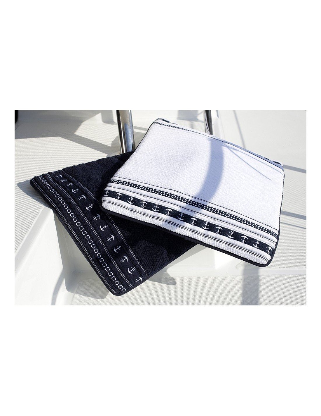 Suave alfombrilla, aterciopelada y agradable al tacto, evita resbalar en el baño gracias a su material PVC. Decorada con un estilo elegante y diseño náutico. Con motivos anclas bordadas en azul. La alfombra es parte de la colección SANTORINI, dispone de juegos de toallas, edredones y sábanas. Todos sus accesorios textiles necesarios para baño y cama. Tanto para nuestra casa como para el barco.