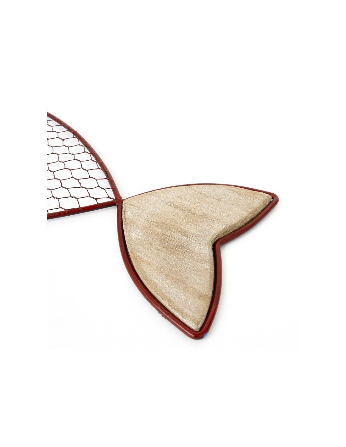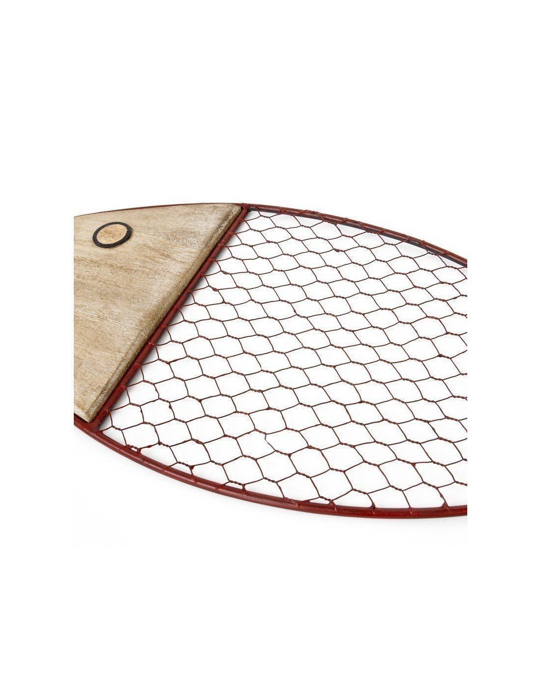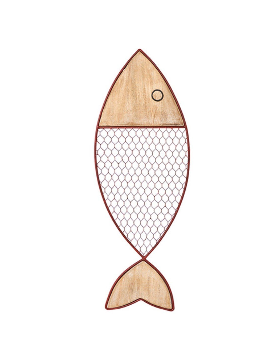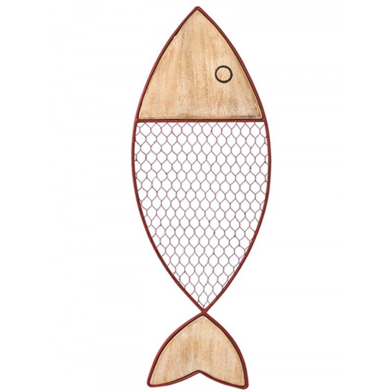 Pez náutico de metal y madera para la decoración de salones de segundas residencias playeras. Pescado marinero de mediano tamaño, hecho a mano en artesanía marinera de metal y madera con excelentes acabados. Presenta un diseño muy llamativo, con enrejado metálico en tono rojo que simula las escamas del pez. Con cabeza y cola talladas en madera noble, que le aporta frescor y un toque rústico muy marinero a la pieza. Ideal para lucirse en paredes amplias y bien iluminadas.