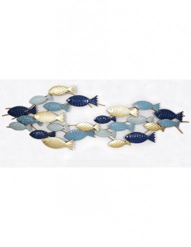 Mural náutico con diseño natural de la vida marina en forma de banco de peces de distintos tamaños y pintados con colores brillantes tales como el azul, dorado y celeste.
