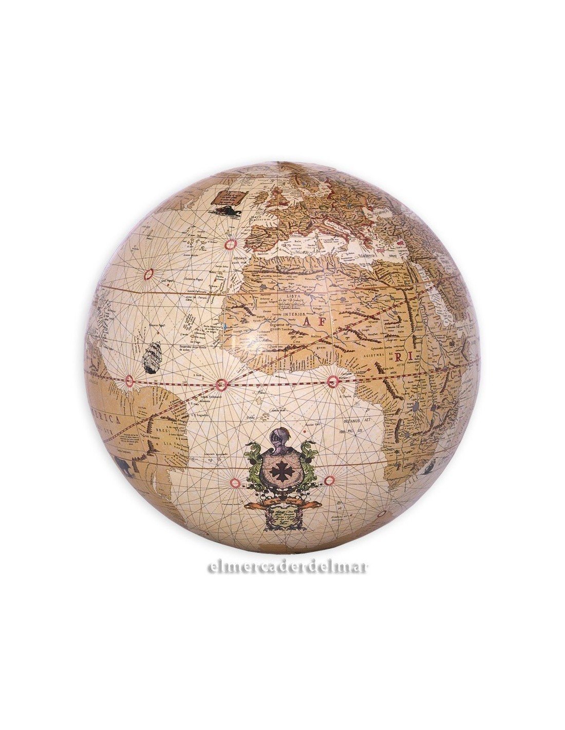 Globo terráqueo o mapa esférico del mundo según grabados del siglo XVI por el cartógrafo y matemático Gerardus Mercator, elaborado en artesanía marinera en plástico y papel impreso.
