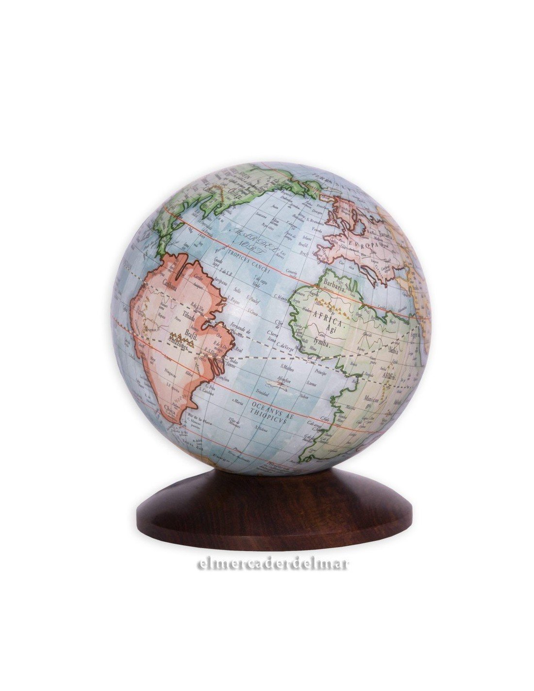 Mapa esférico o Globo terráqueo según grabados de Abrham Ortelius construido en artesanía marinera con la tradicional técnica de gajos o pedazos de papel impreso en forma de triángulo para conseguir la forma esférica del mapa sobre un soporte o peana de madera