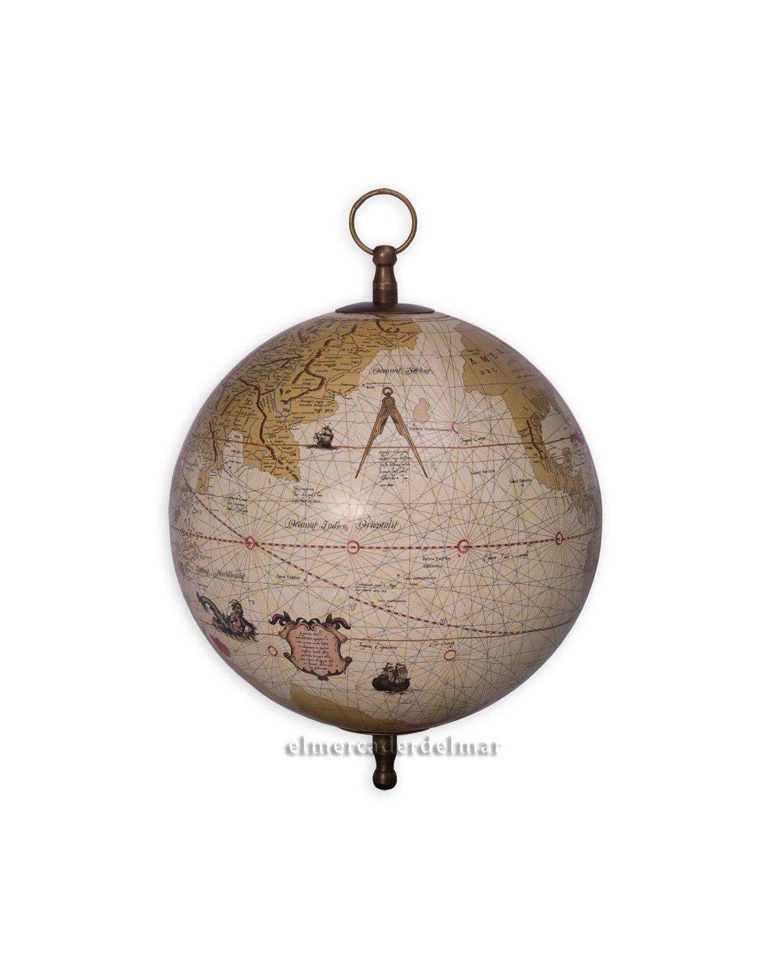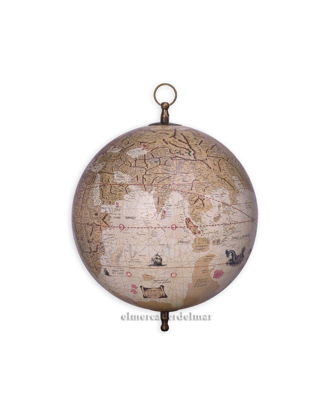 Globo terrestre según grabados antiguos elaborado con técnicas tradicionales en papel impreso y soporte esfera de plástico con soporte de latón para colgar.