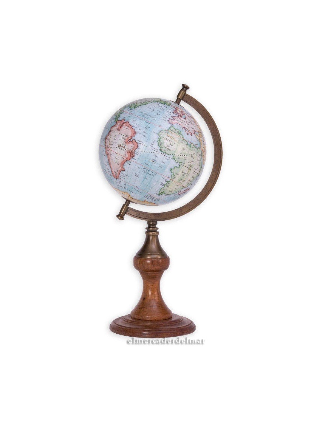 Globo terráqueo o mapa esférico con soporte en madera torneada y media luna en latón según grabados de Abraham Ortelius construido con la tradicional técnica de gajos o pedazos en forma de triángulo para conseguir la forma esférica del mapa.