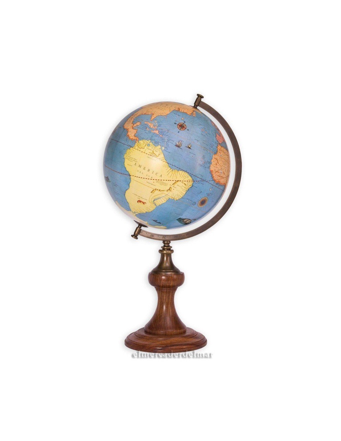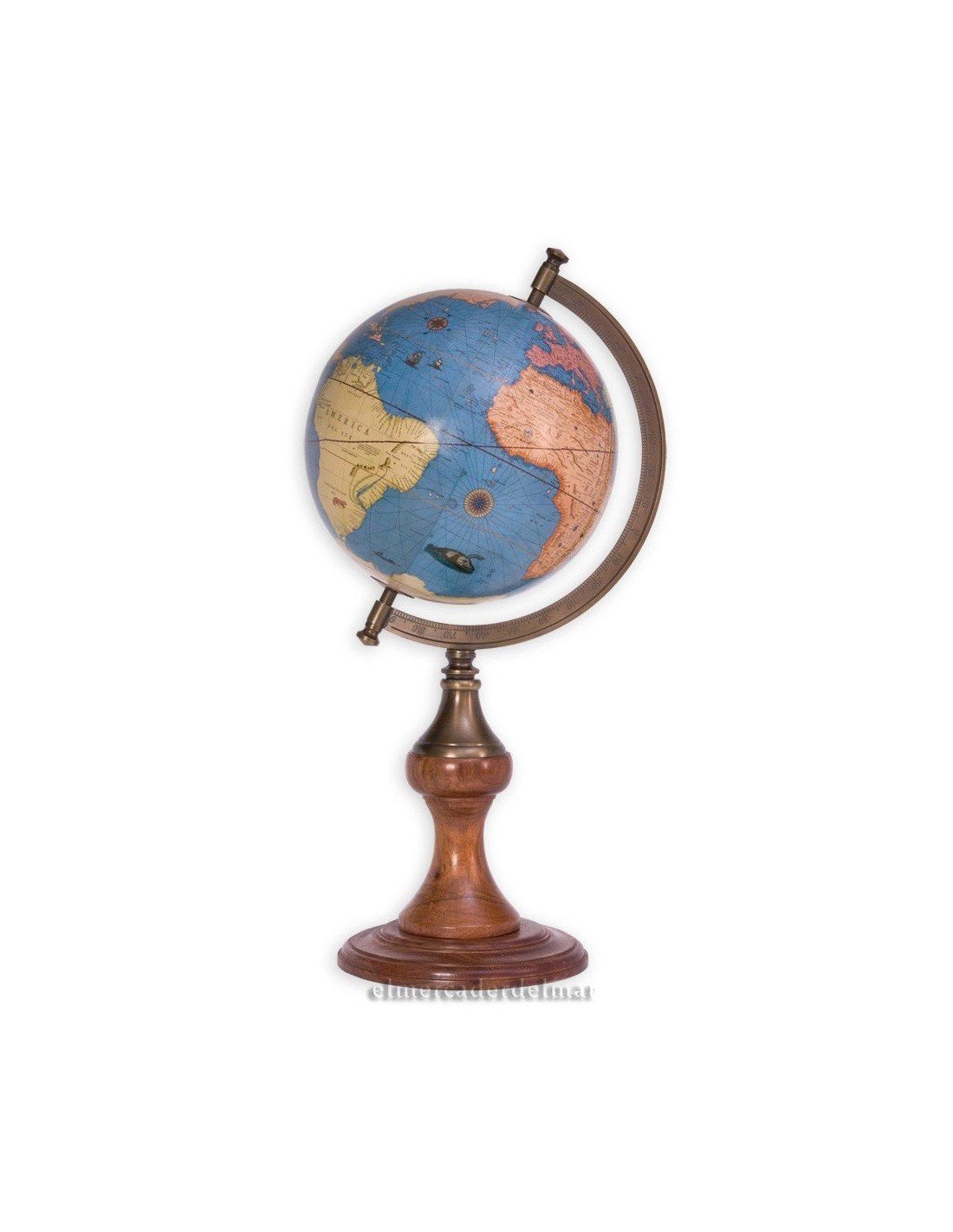 Globo terráqueo o mapa esférico con soporte en madera torneada y media luna en latón según grabados antiguos elaborados con técnicas tradicionales en papel impreso.
