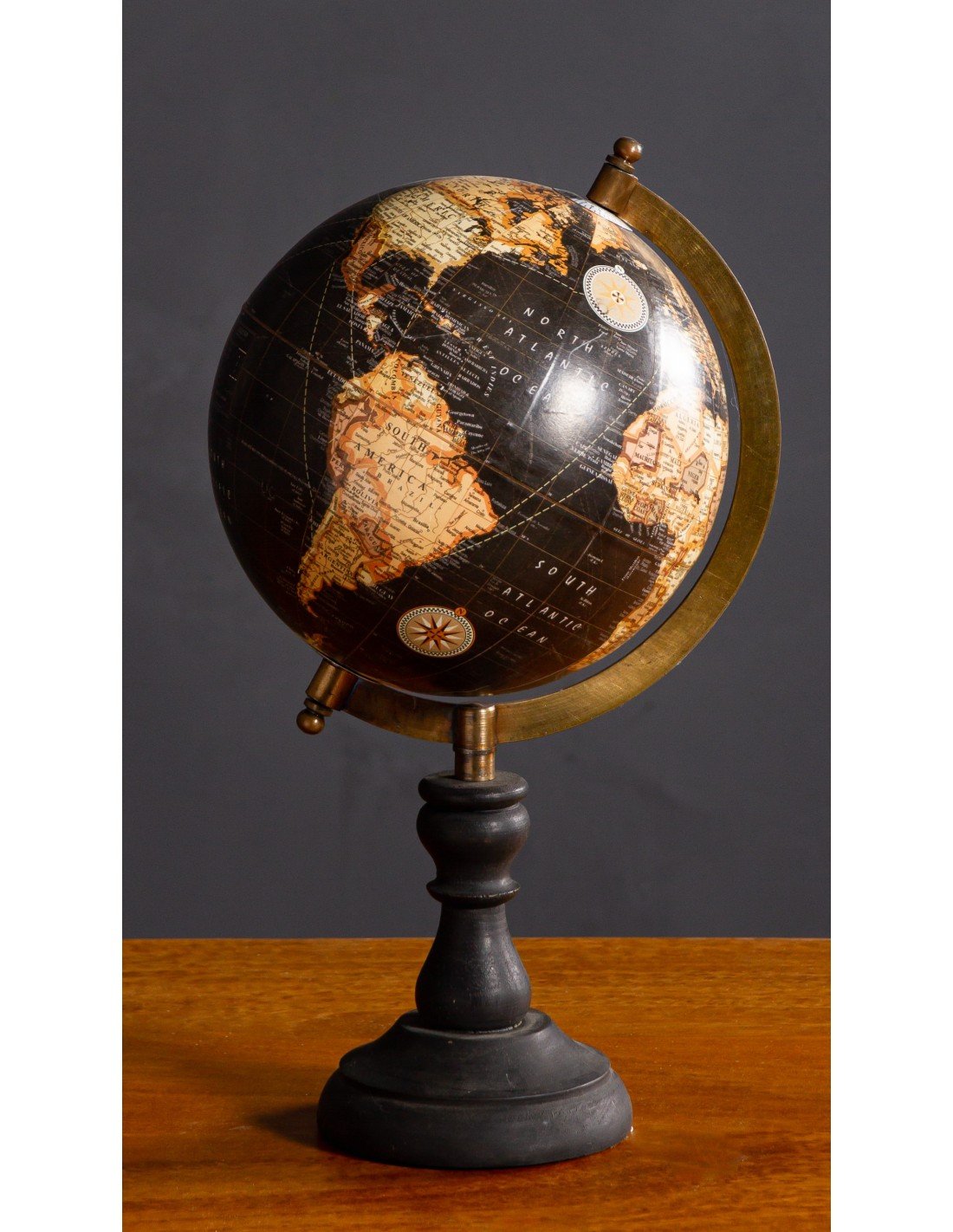 Elegante globo terráqueo con el mapa del mundo sobre una peana de madera de mango, fabricado mediante técnicas de artesanía náutica. Para ambientes de exploradores y aventureros.