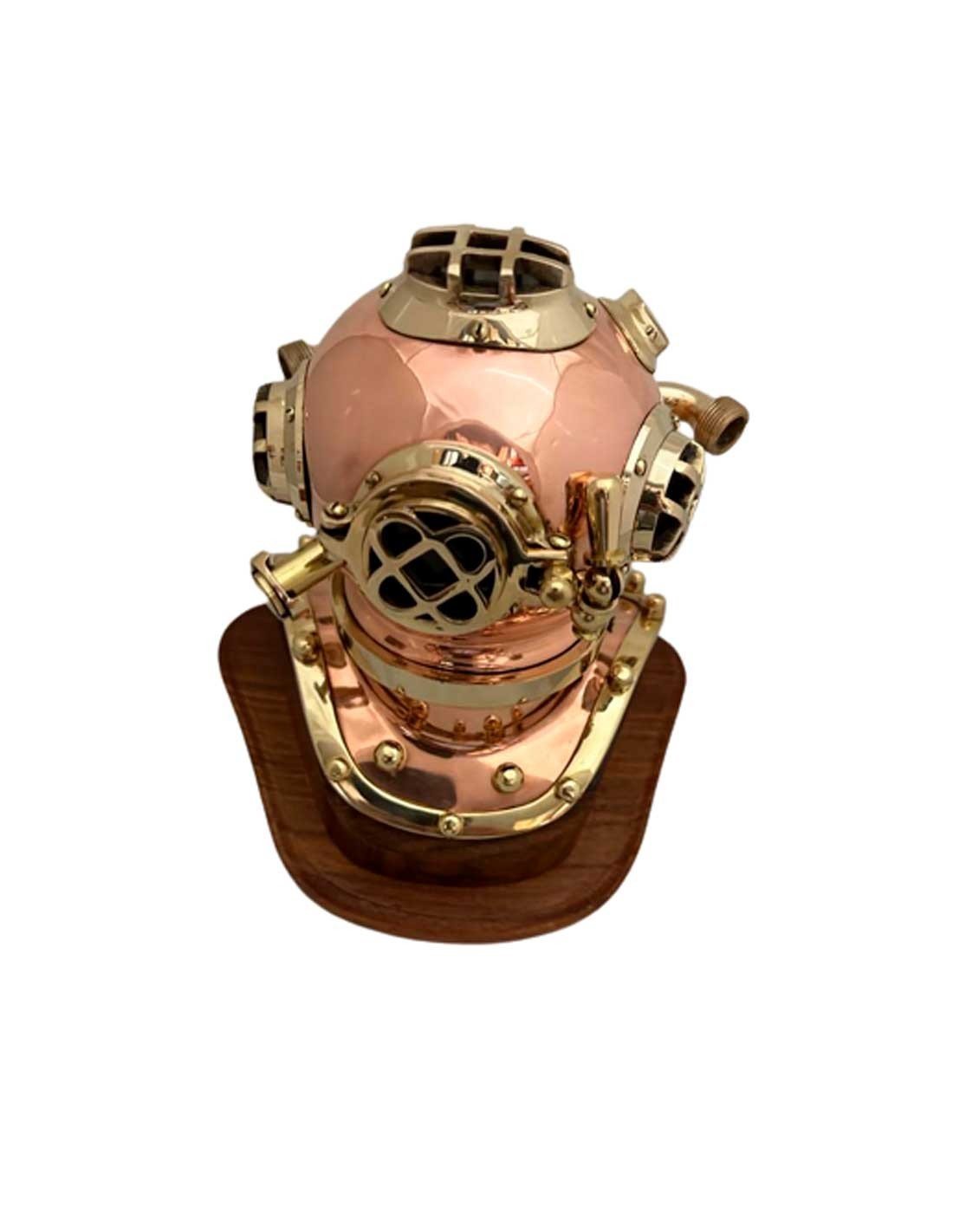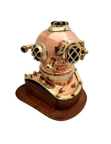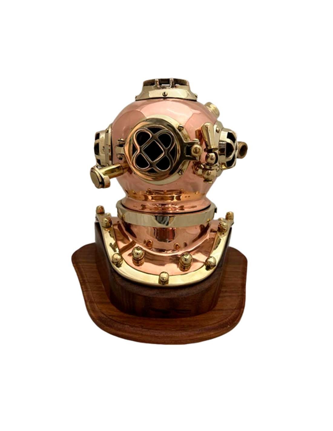 Escafandra de buceo de artesanía náutica elaborada en cobre repulsado y latón de fundición a la arena y pulida brillante para exponer de sobremesa.