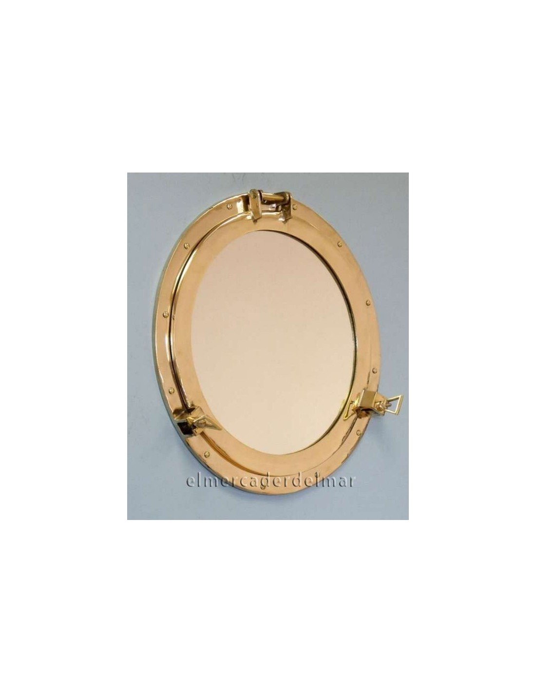 Portillo marinero con espejo en latón de fundición con acabado pulido brillante y con bisagra y anillas para la apertura.