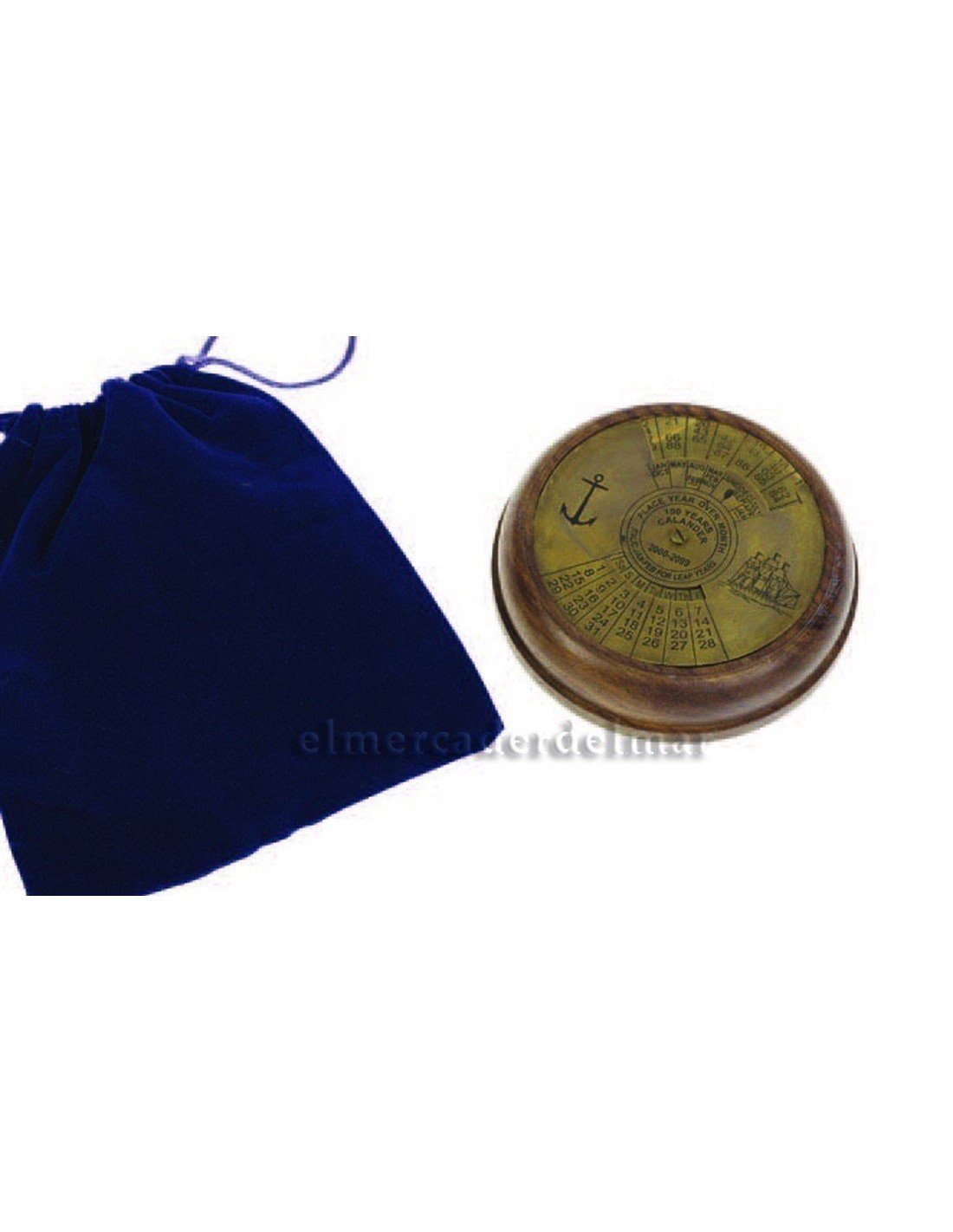 Calendario perpetuo elaborado en chapa de latón con acabado envejecido y con bolsa de algodón de presentación.