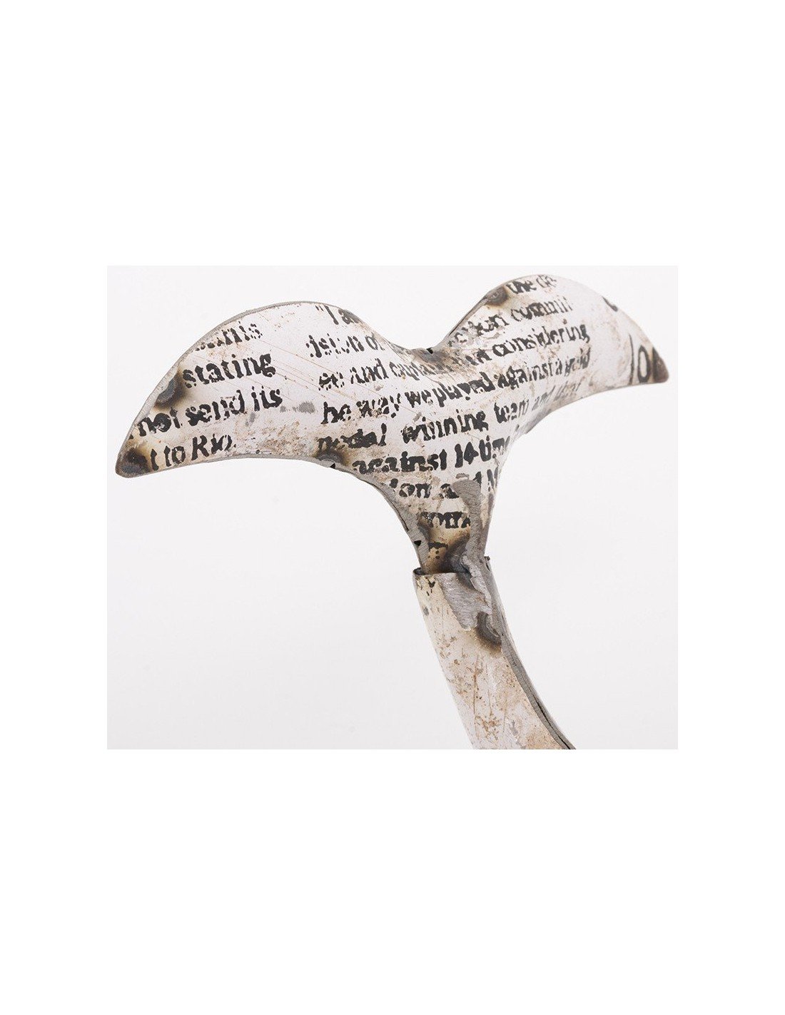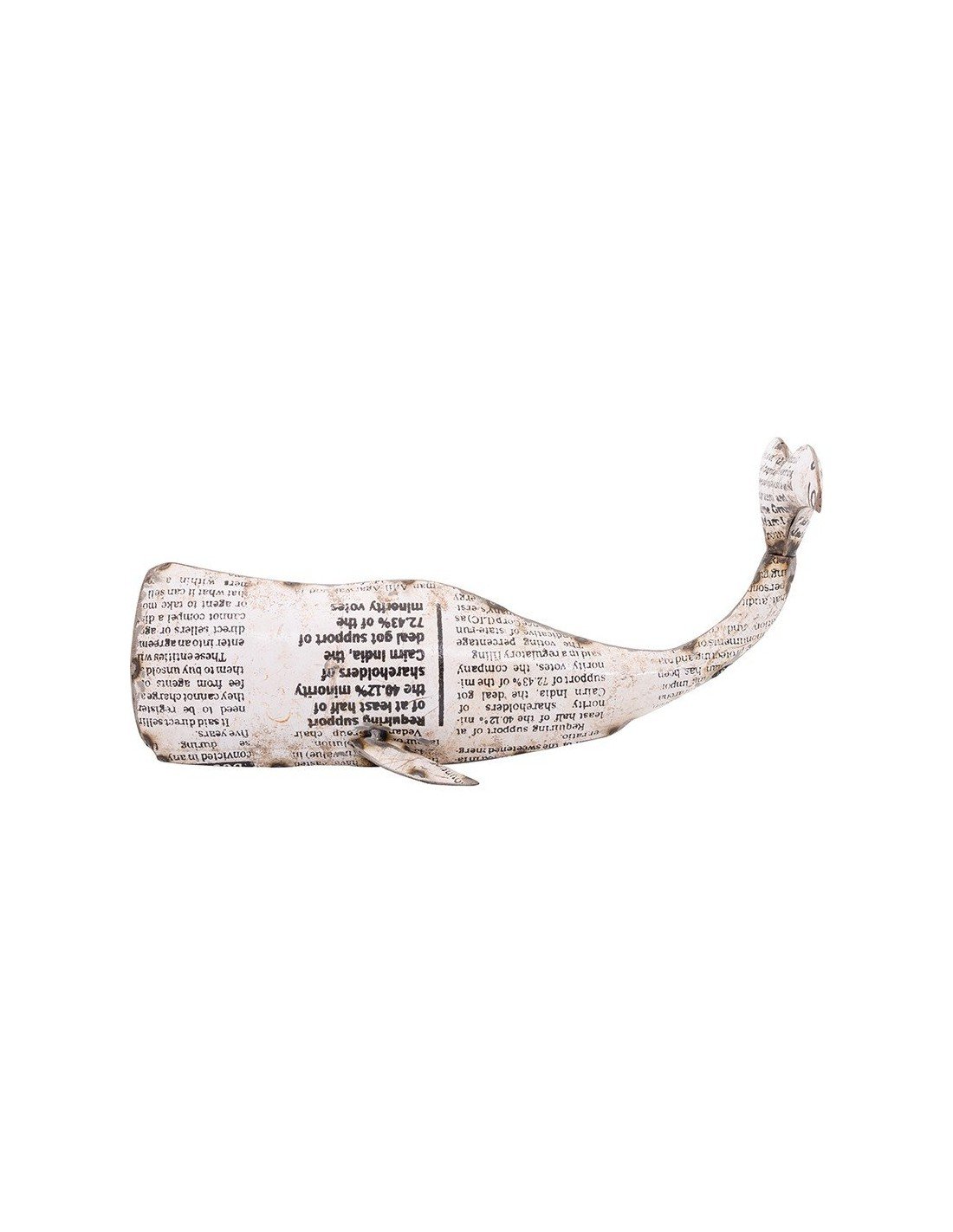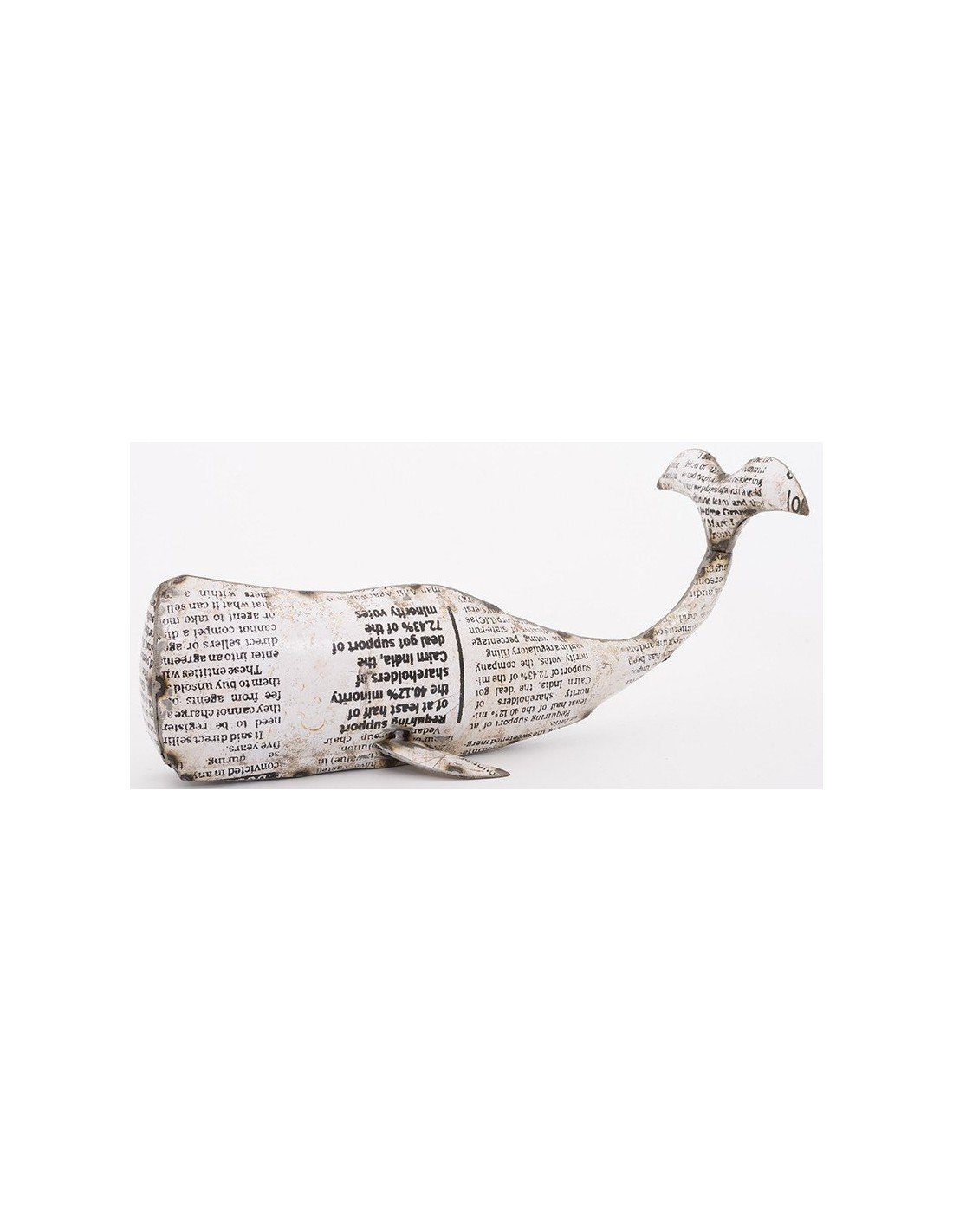 Ballena marina decorativa en miniatura para ambientar de forma original las estanterías y mesas del hogar. Fabricada a mano en hierro repulsado, con inscripciones en la superficie de su chapa blanca. Es una pieza única en su fabricación y diseño. No existen dos piezas iguales debido a que están hechas en metal reutilizado de contenedores en forma de bidón.