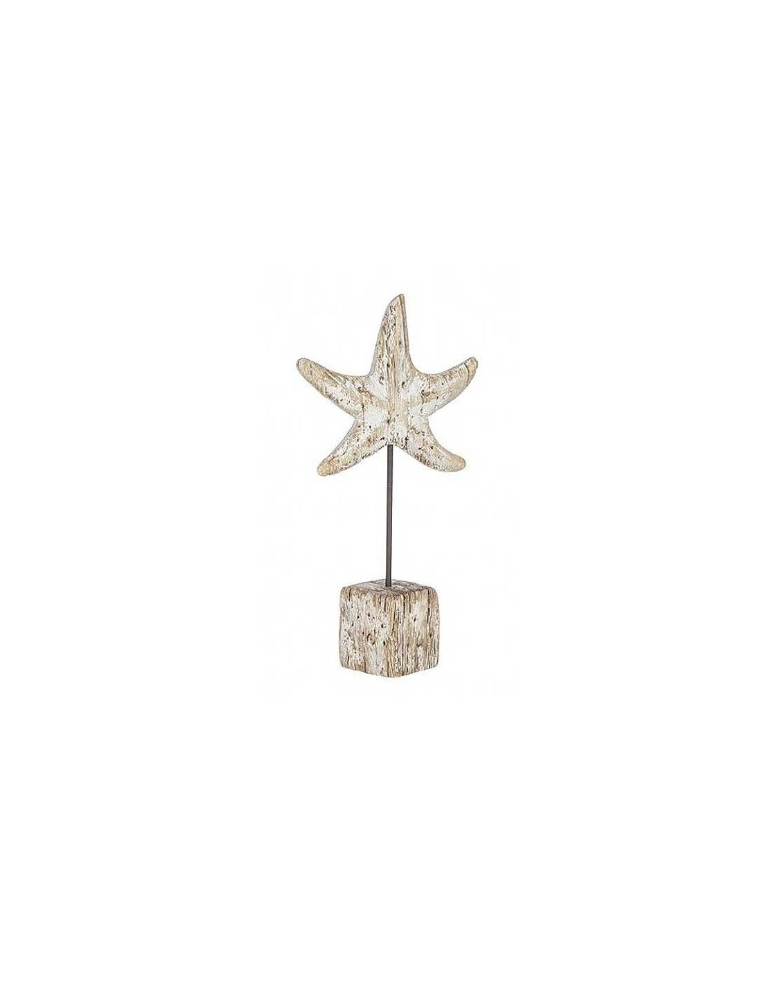 Escultura estrella de mar náutica decorativa tallada artesanalmente en madera natural y pintada con ligeros toques de blanco en su superficie. La madera conserva su aspecto natural, con pequeñas fisuras y detalles en metal incrustados, como grapas y clavos. Acabado desgastado y rústico. La pieza se encuentra suspendida sobre peana con varilla de metal y base de madera. Perfecta para dar un aire navy a la decoración de la estancia.