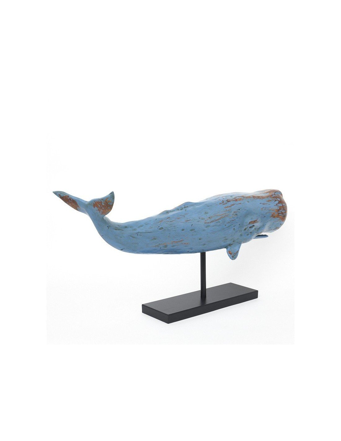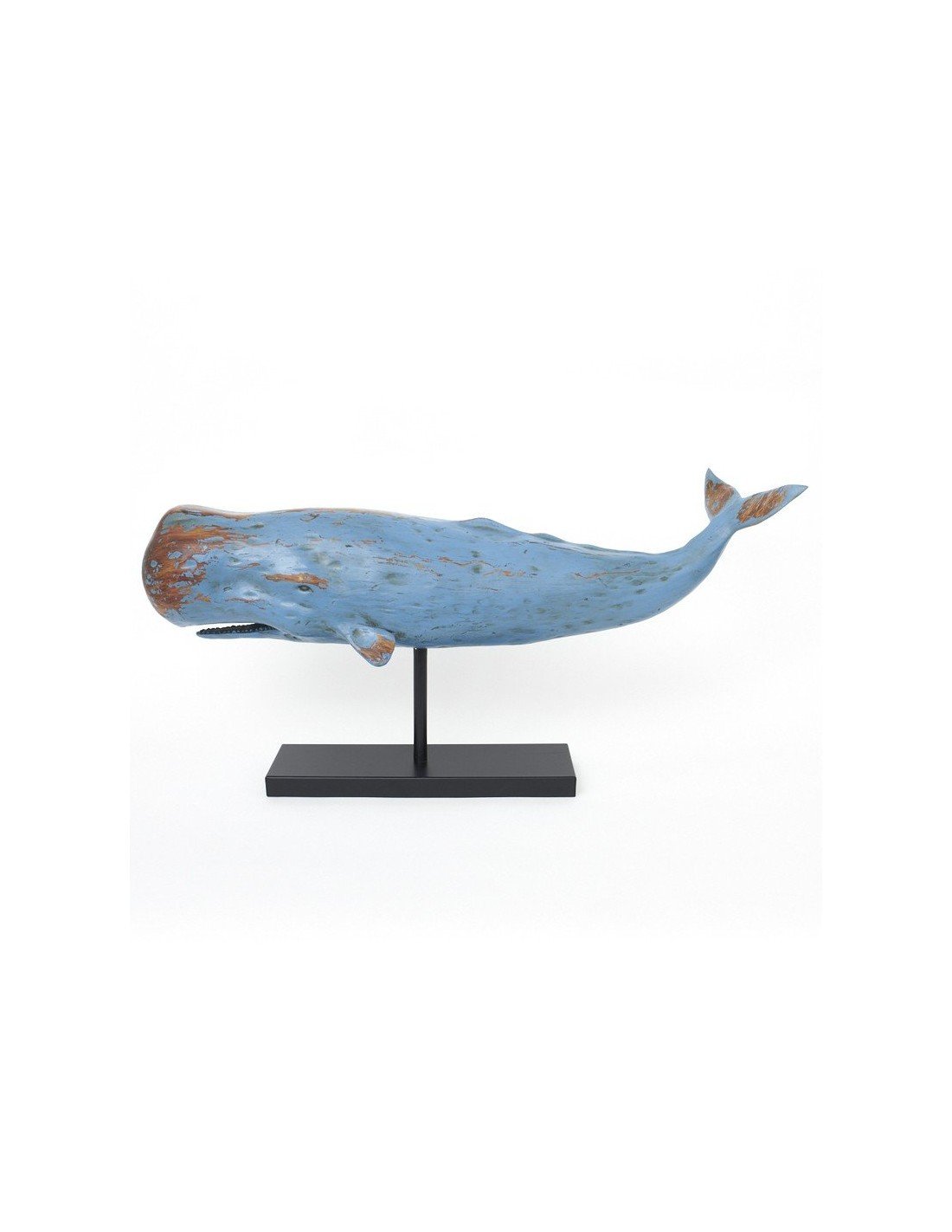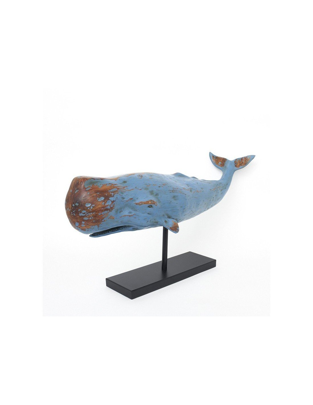 Figura náutica de cachalote realizada en resina imitando la madera. Pintada en color azul marino con efecto desgastado en algunas de sus partes. Presenta una elegante peana negra que realza la figura de la ballena náutica. Ideal para decorar ambientes con aires de mar. Perfecta para lucirse en oficinas, despachos, sobre una chimenea o mueble auxiliar. Es una figura marinera ligera, muy original, su calidad y textura imitan a la perfección la madera.