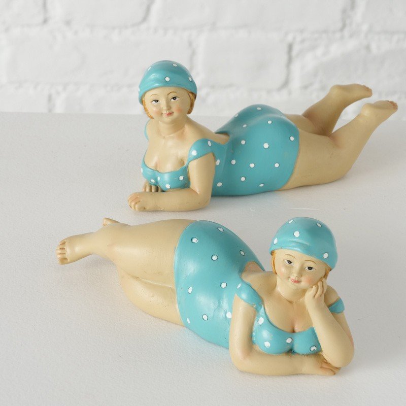 Disponibles en dos modelos: Bañista tendida con la mano en el rostro, bañista tendida con las manos juntas