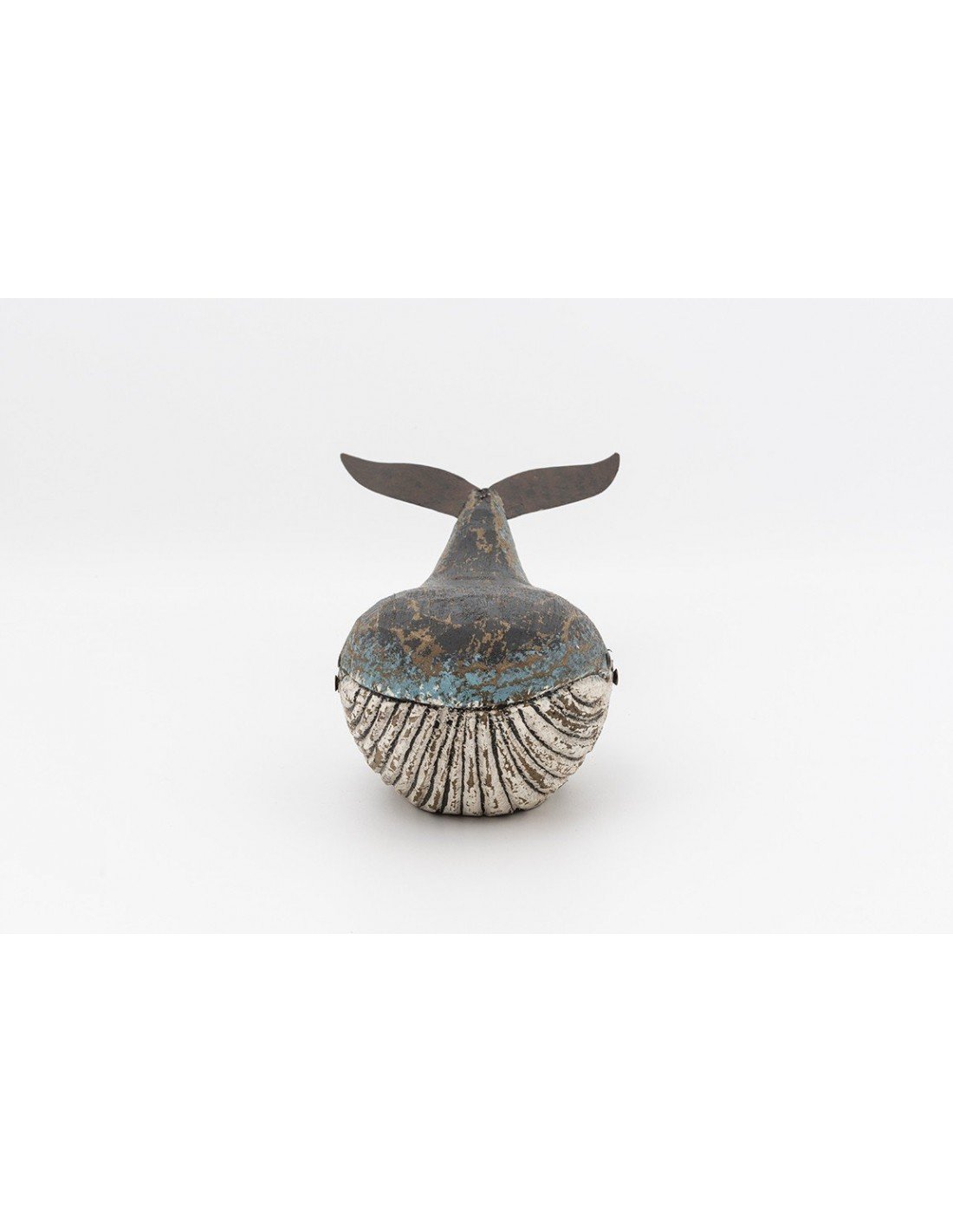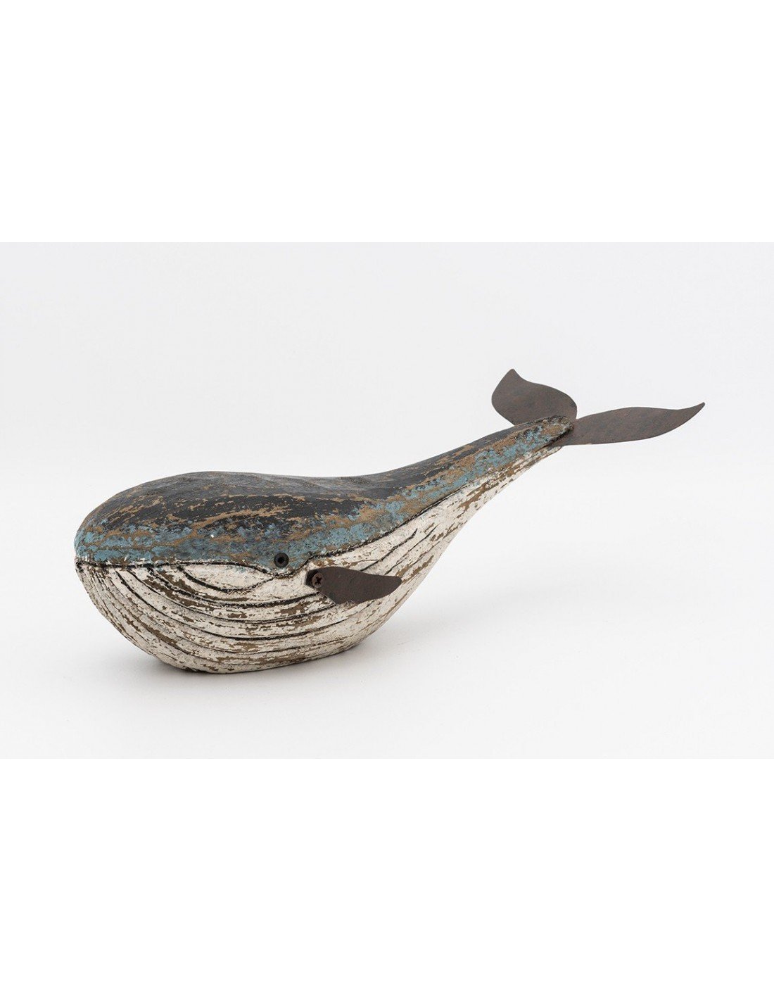 Figura ballena marina decorativa hecha a mano en madera natural y elementos metálicos. Adecuada para combinarse con otras figuras marineras en la decoración de tus estanterías.