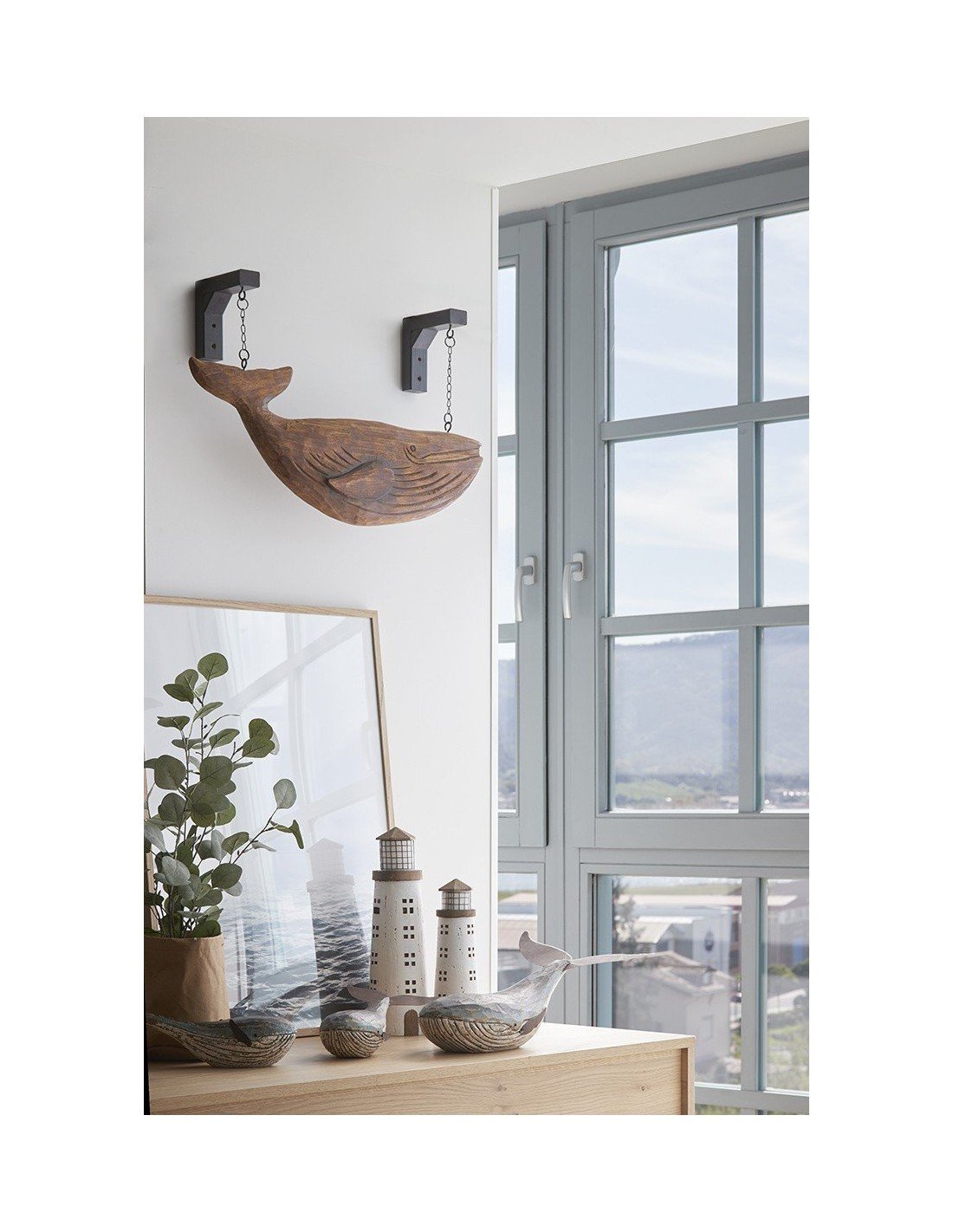 Reproducción de una ballena náutica decorativa manufacturada en madera natural. Pintada en tonos blanco y azul, imitando el efecto desgastado de la madera expuesta a las inclemencias del mar. Tallada con diversos detalles en su superficie y elementos en metal en las aletas y la cola, que le dan un toque realista y rústico a la pieza. De diseño único y atemporal, resaltará el conjunto decorativo aportando naturalidad y luminosidad. Combinable con otra figura decorativa ballena de madera presente en nuestra web.