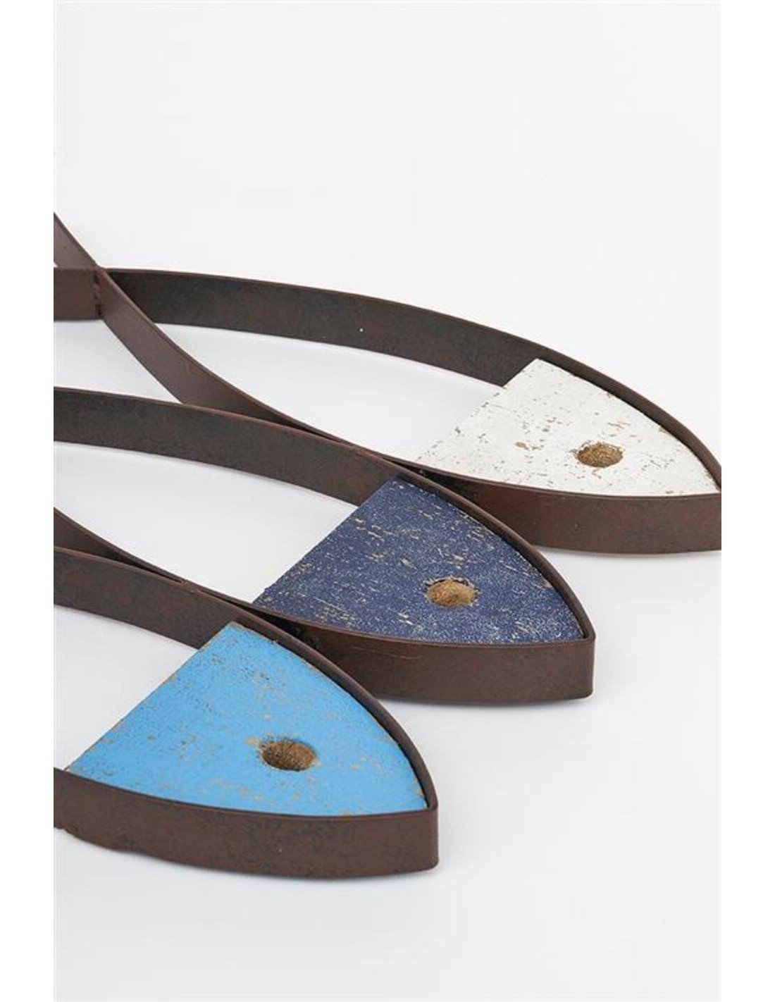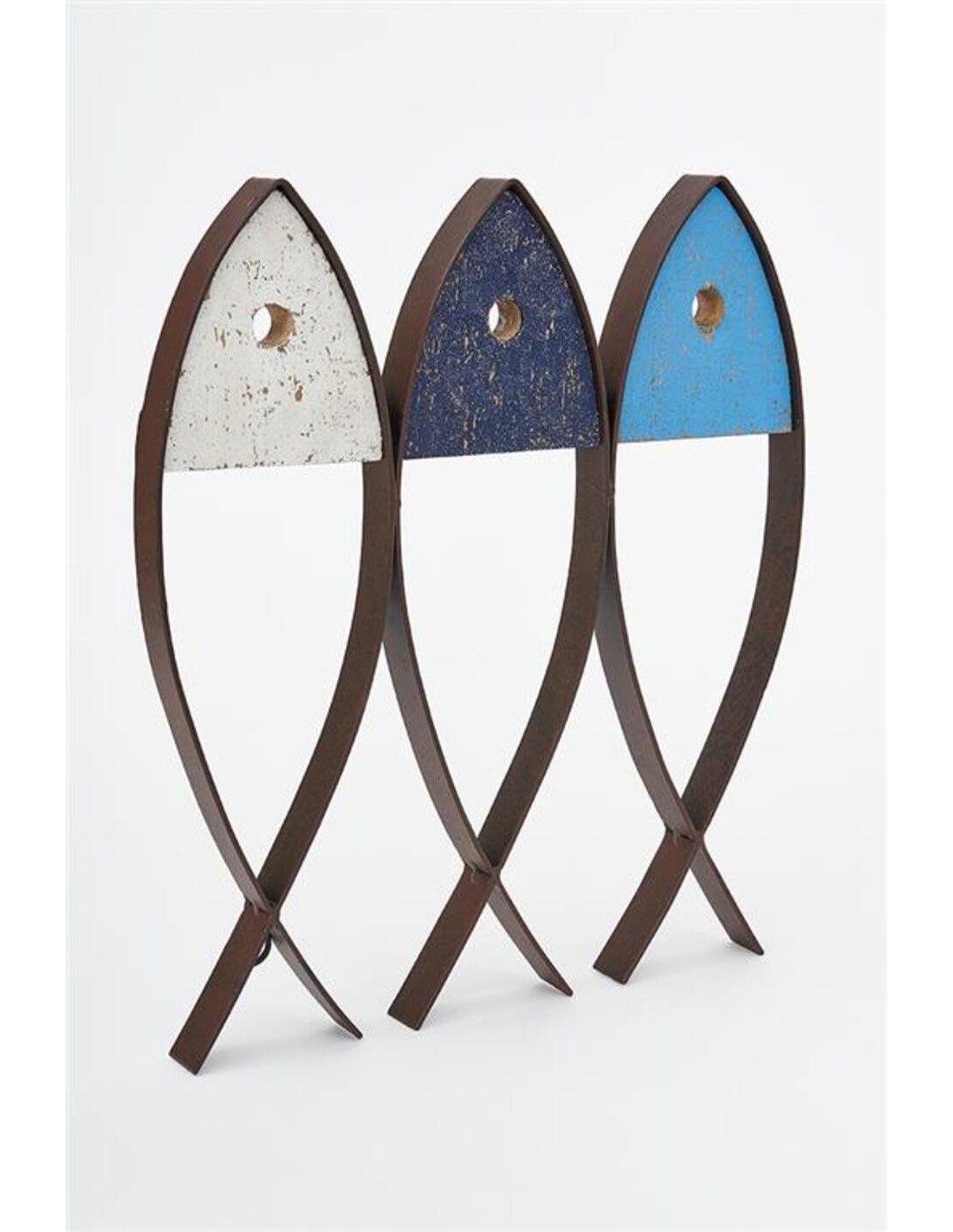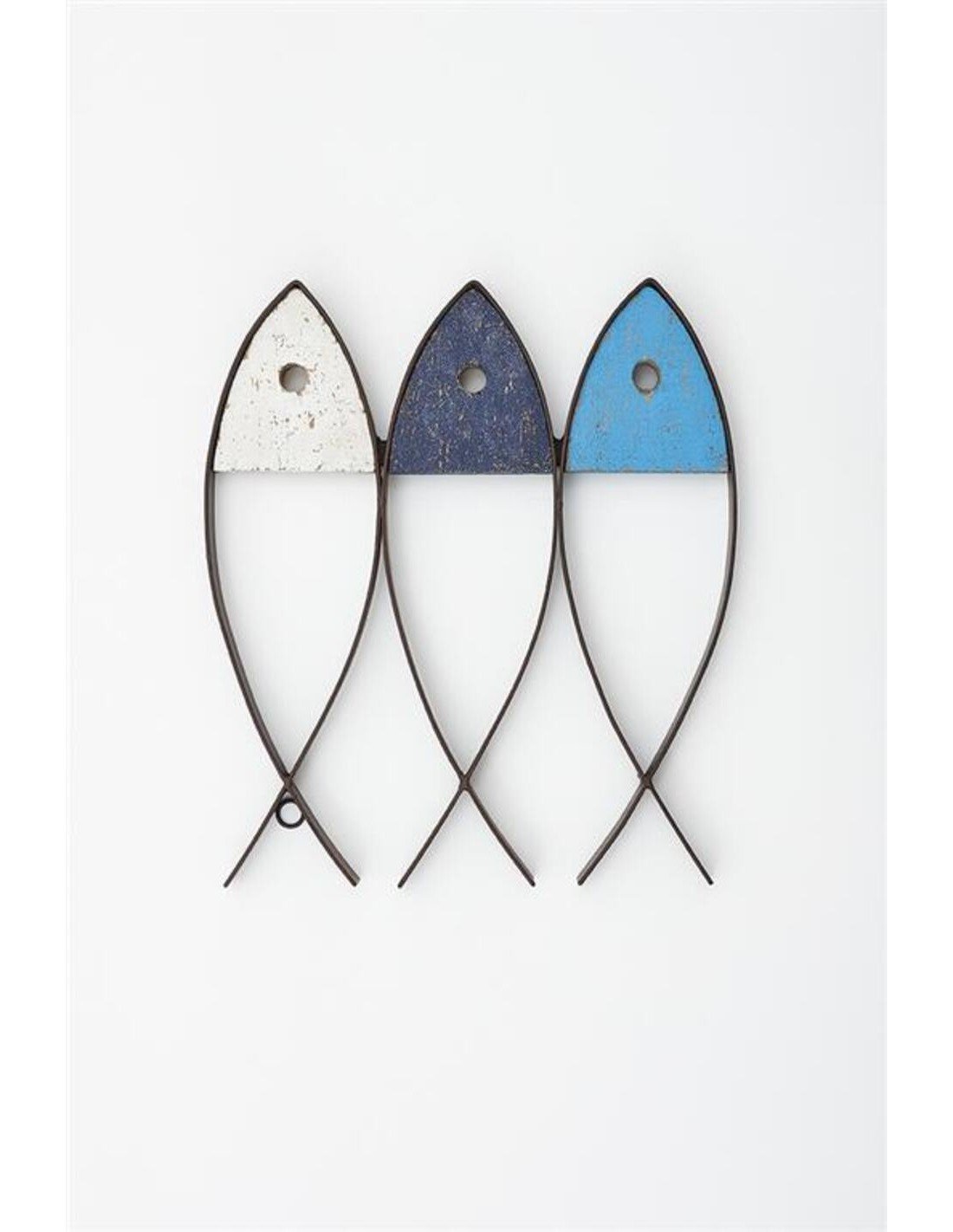 Murales de meta de tres peces de mar, elaborado en material de gran durabilidad que cuenta con trozos de madera dentro de la figura y están pintadas de azul, celeste y blanco que simulan estar desgastados, creando una atmósfera retro.