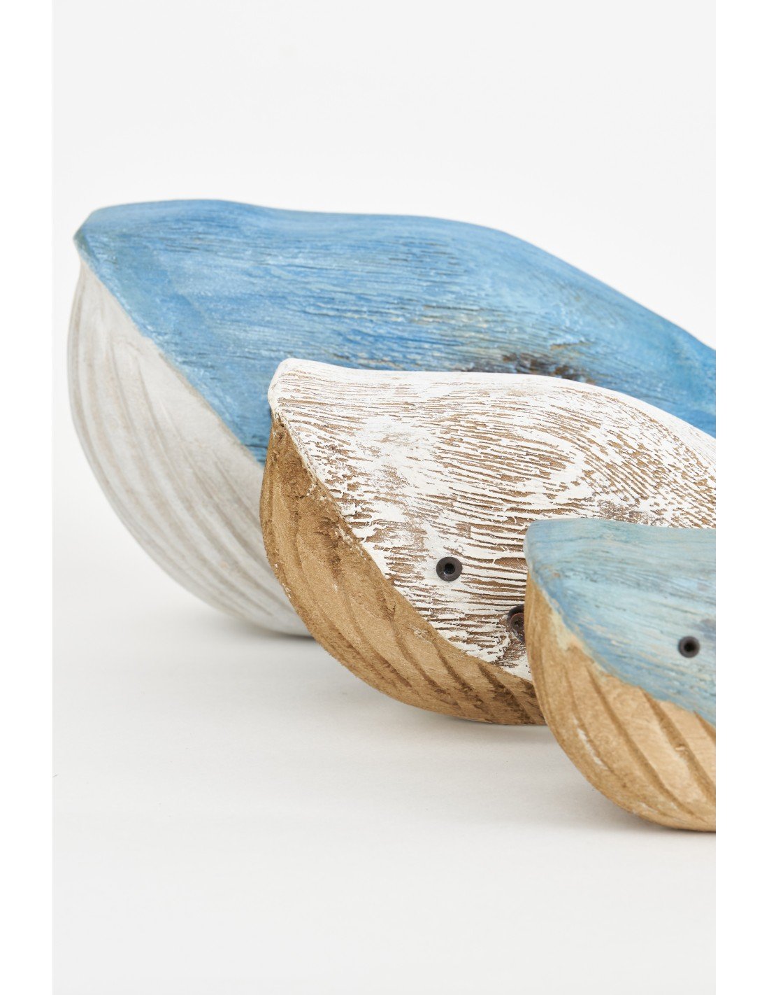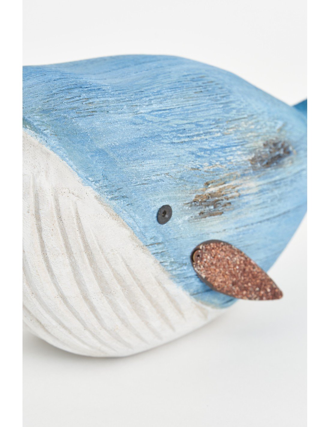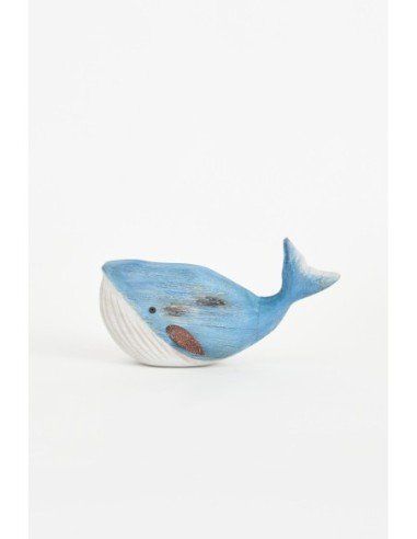 Esta ballena decorativa de madera y metal, pintada en tonos blancos y azules, es una pieza encantadora con un estilo desgastado que evoca la serenidad del mar. Ideal para añadir un toque marino y elegante a tu decoración.