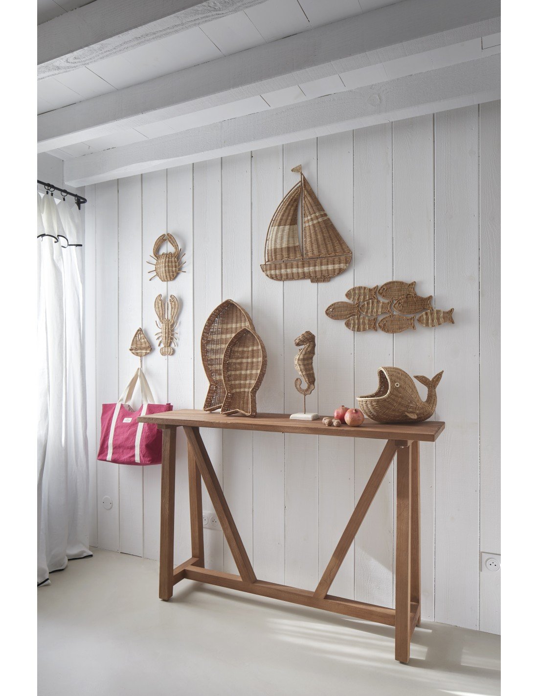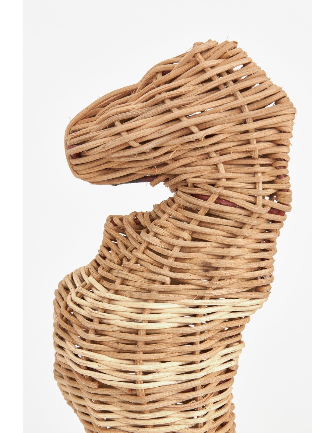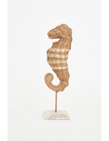 Figura de caballito de mar elaborada en ratán, con una base de madera robusta que garantiza su resistencia y estabilidad. Este caballito de mar, con su diseño detallado y delicado, evoca la magia y la belleza del océano. El ratán, con su textura natural y tonos cálidos, añade un toque de encanto y autenticidad a la figura.