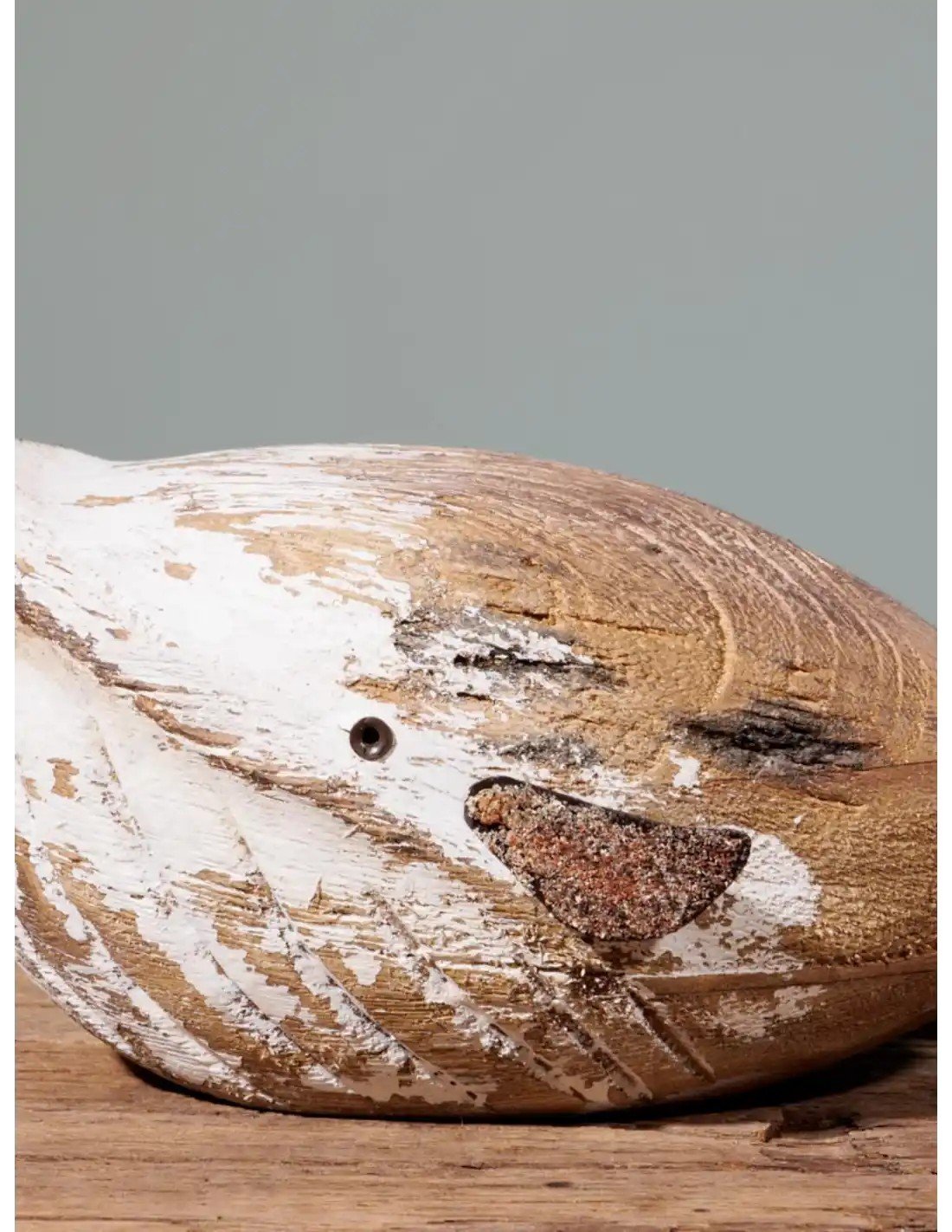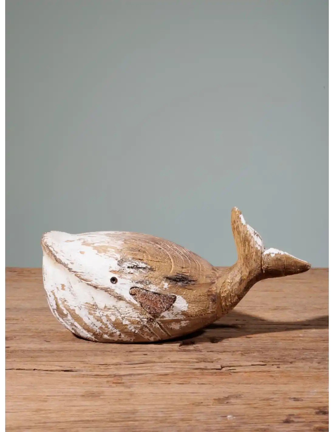 Ballena decorativa elaborada en madera de paulownia con un acabado envejecido que combina tonos naturales y blancos, aportando carácter y esencia mediterránea a cualquier espacio. Su diseño artesanal y textura desgastada evocan la calma del mar y el encanto de la decoración costera.