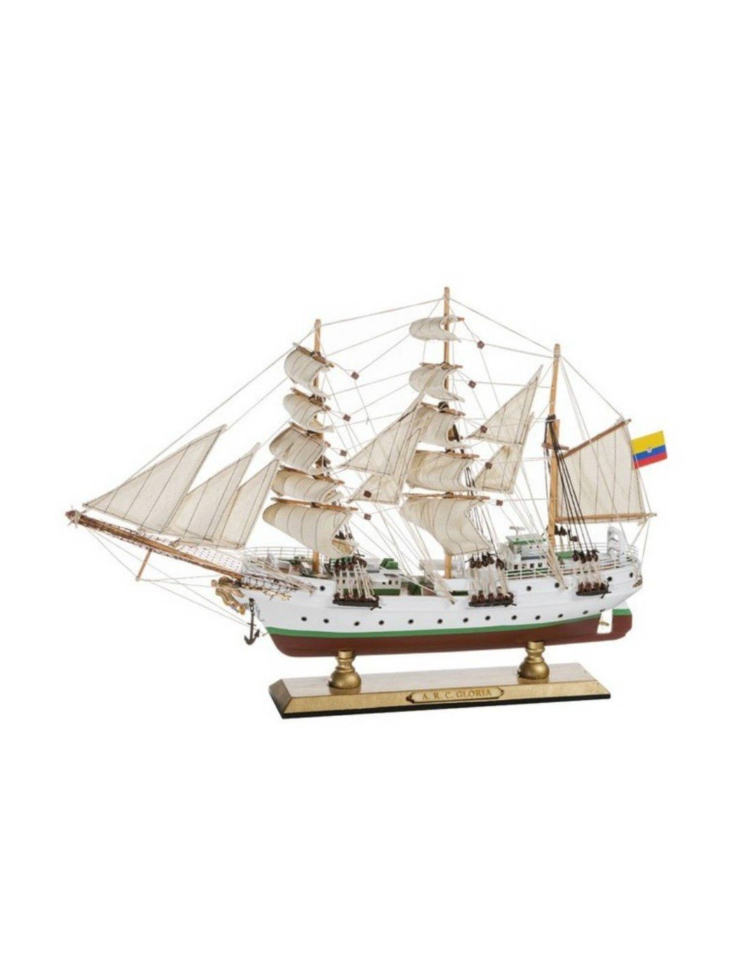 Maqueta decorativa de barco fragata Arc Gloria ensamblada respetando las tradiciones artesanales de la modelación y decoración marinera. Hecha de madera noble pintada a mano, dispone de la clásica arboladura con palos y velas textiles.