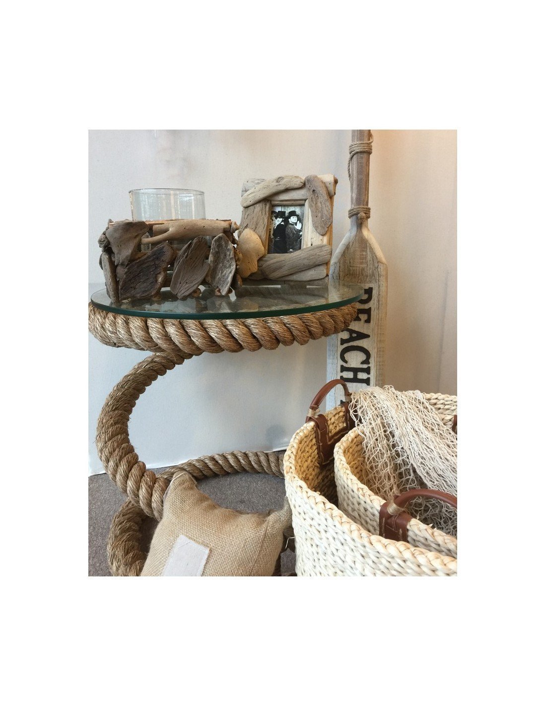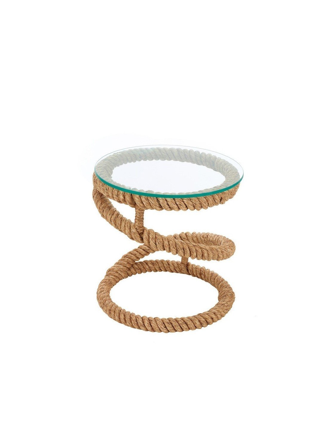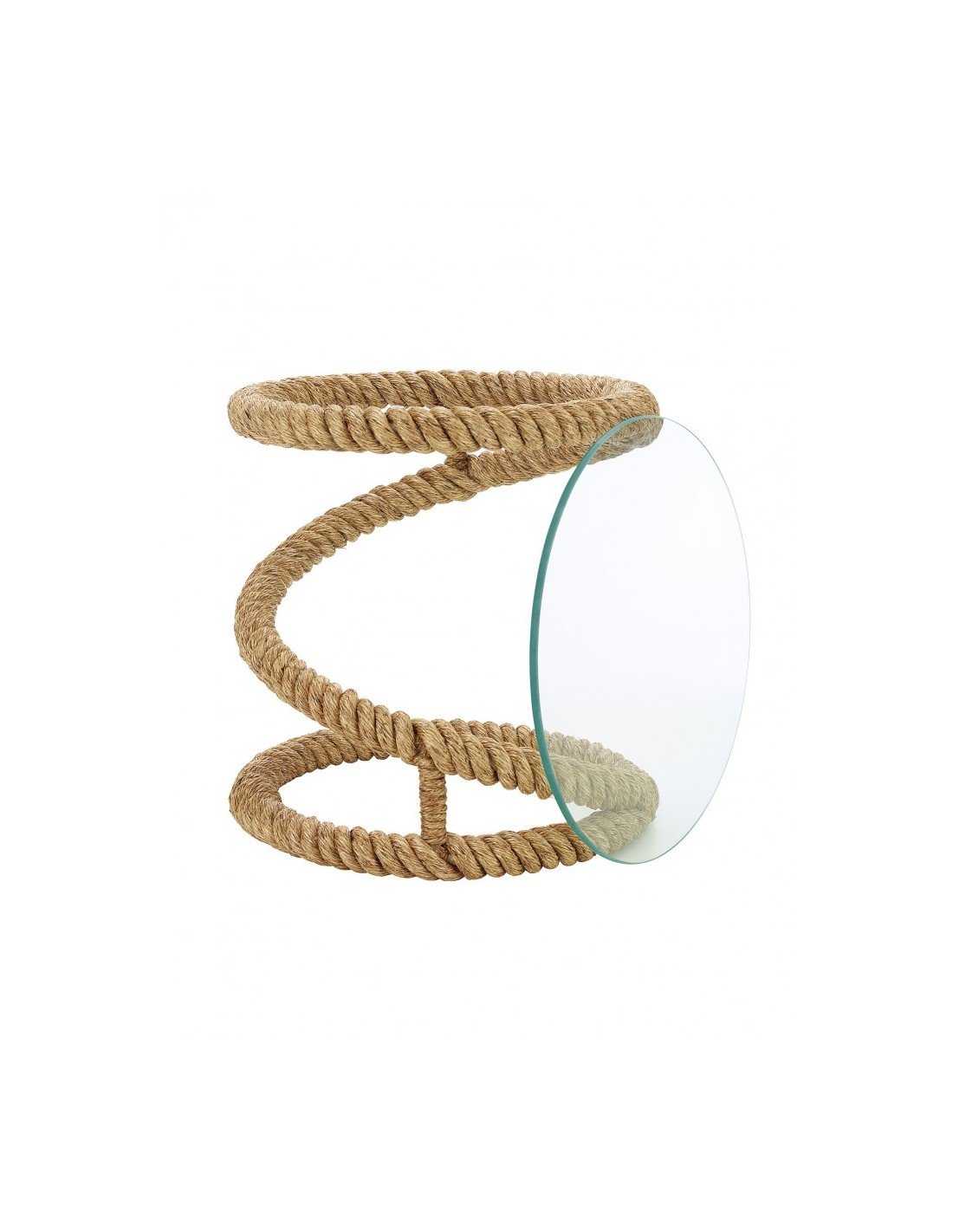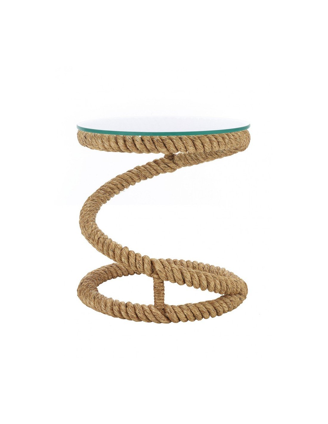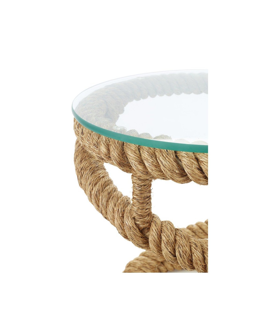 Mueble auxiliar marinero de mesa redonda con estructura de hierro envuelta en cabo grueso de cáñamo con forma circular y de nudo marinero, con cristal ajustado en medidas y biselado para apoyar lo necesario para hacer servir la mesa como vasos, platos, revistas o cualquier otro objeto.