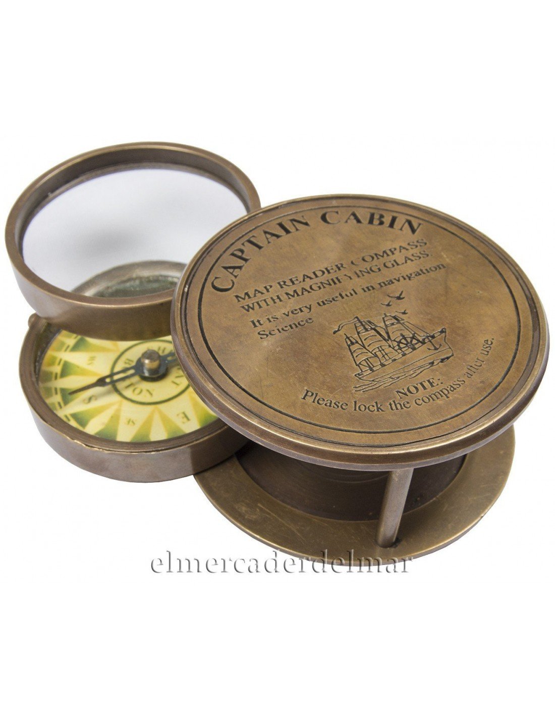 Brújula de sobremesa con lente de aumento elaborado en latón envejecido y soporte con grabado CAPTAIN CABIN.