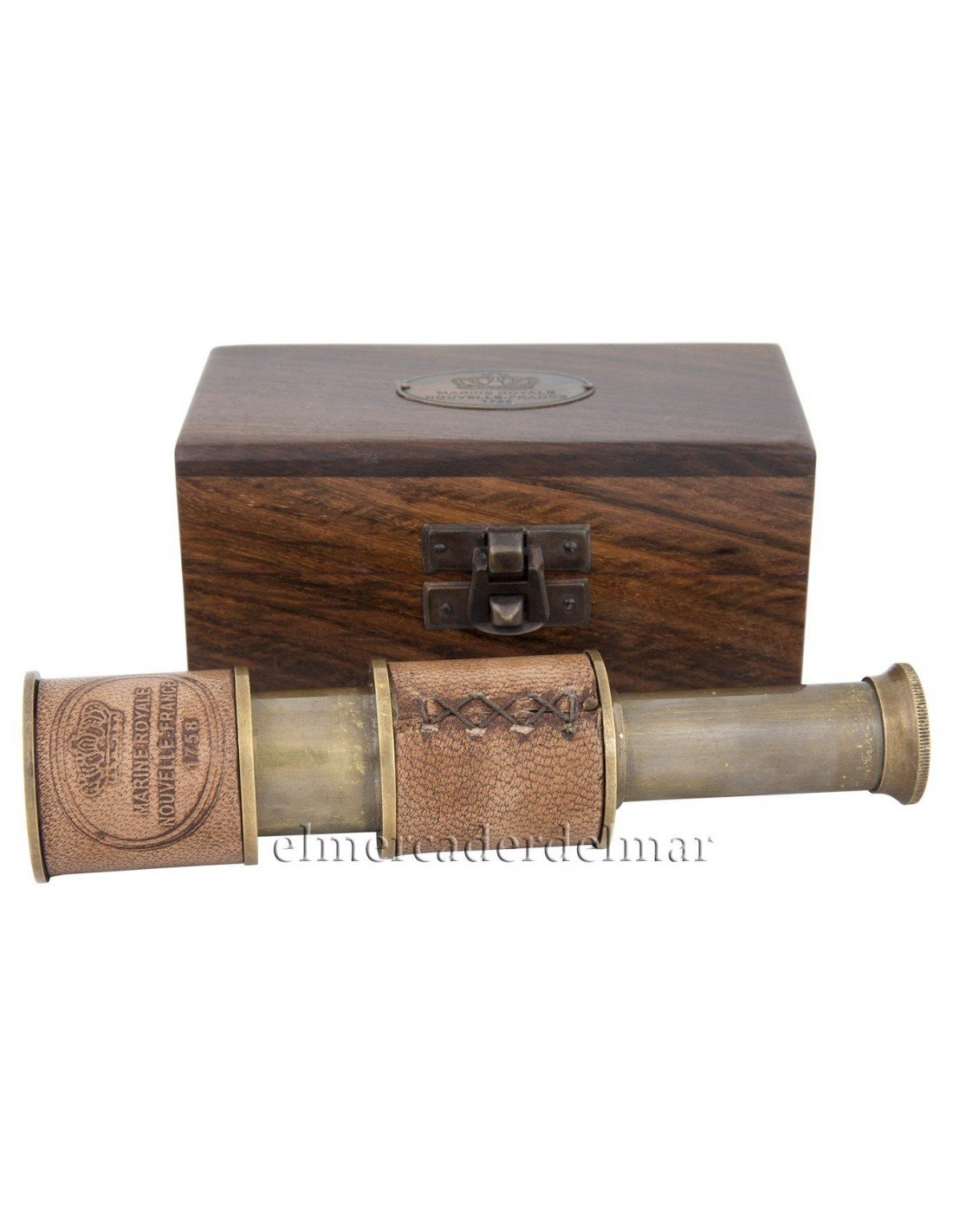 Catalejo telescópico de aspecto envejecido forrado en cuero y presentado en caja de madera con motivos marineros.