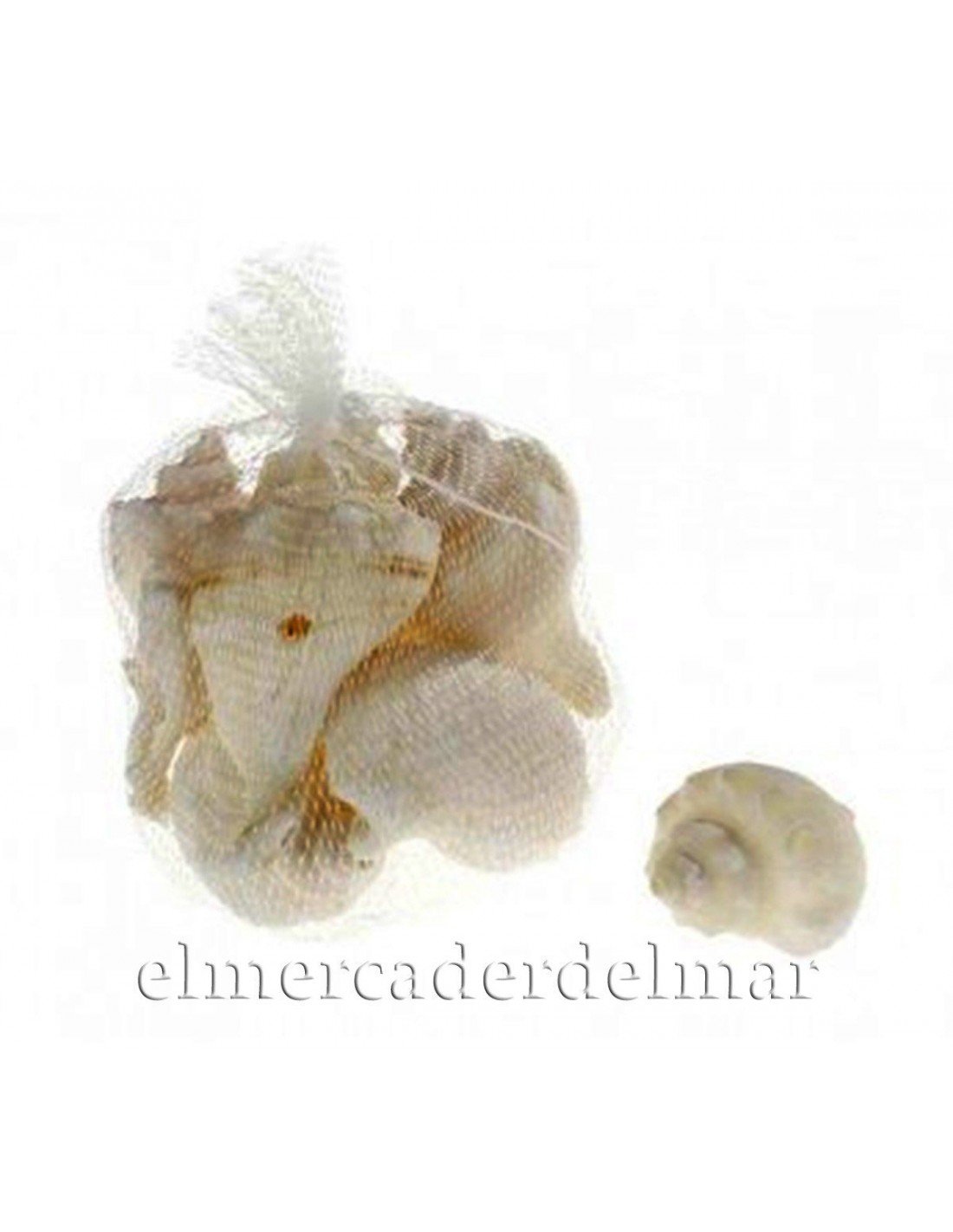 Conjunto de caracoles de mar naturales de la familia de los Melongenidae originarios de las regiones tropicales, vienen en una bolsita de red de nylon blanca.