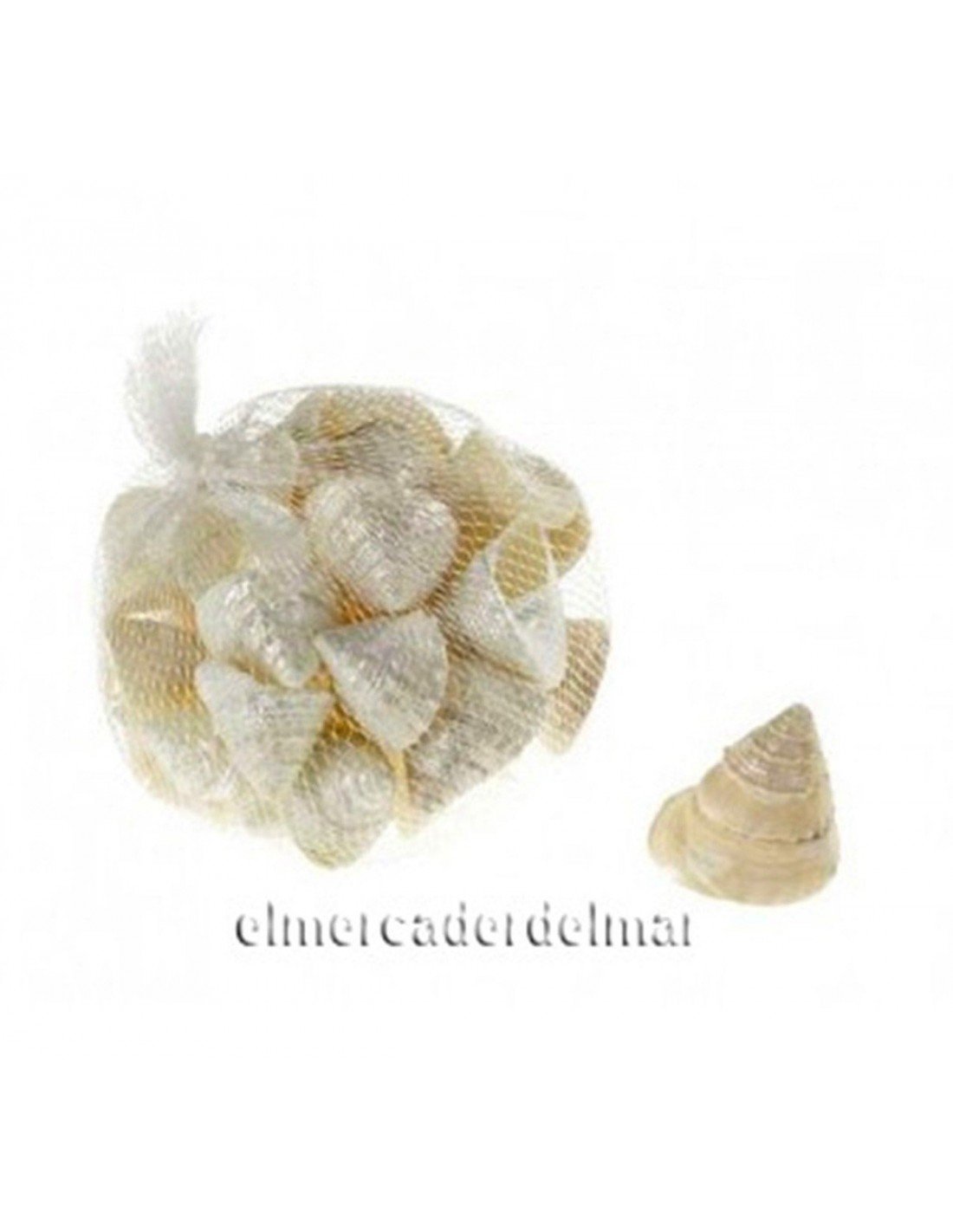 Caracoles de mar naturales llamados "trocha lineatus" , presentados en bolsita de red de nylon de aproximadamente 200 gramos.
