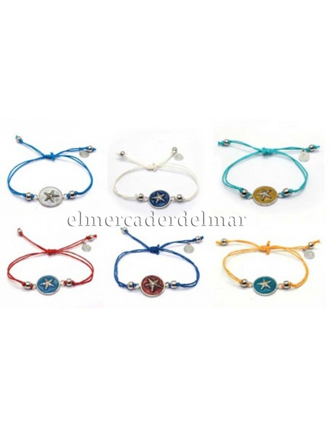 Pulsera náutica con estrella de mar fabricación artesana en algodón y metal esmaltado de diferentes colores.