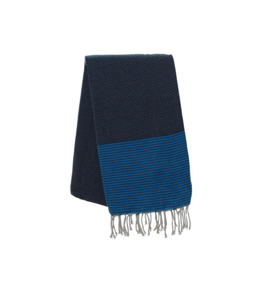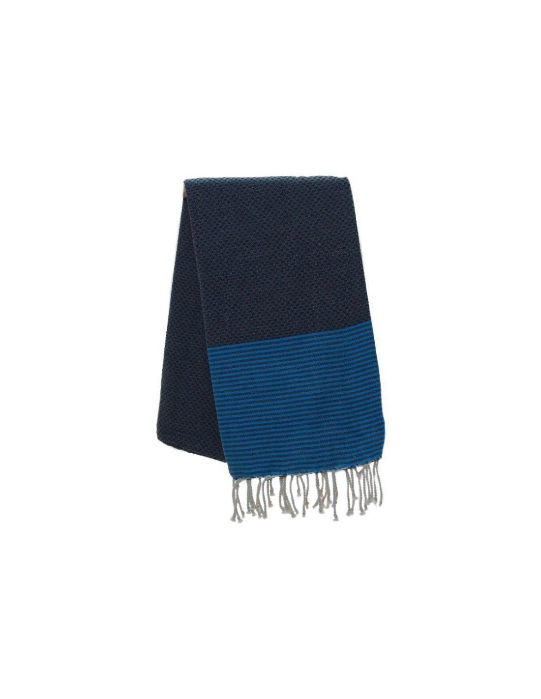 Toalla Fouta polivalente de tejido 'nido de abeja' de color gris oscuro y azul turquesa ideal para la playa o para decorar la casa o para cubrir el sofá.