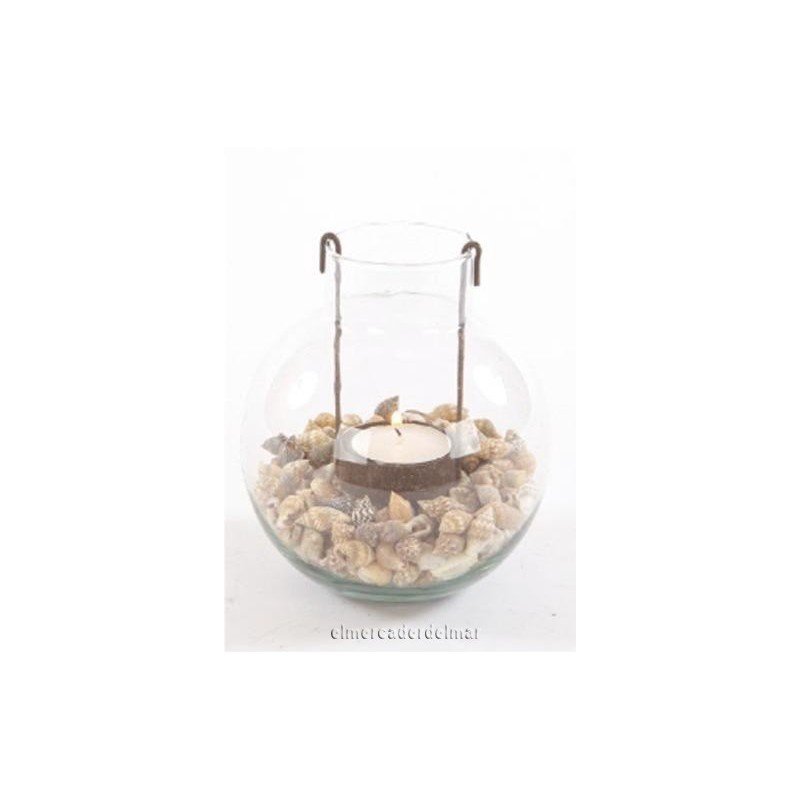 Porta velas náutico elaborado artesanalmente en vidrio, en el interior caracolas marinas como base de apoyo para ubicar la vela.