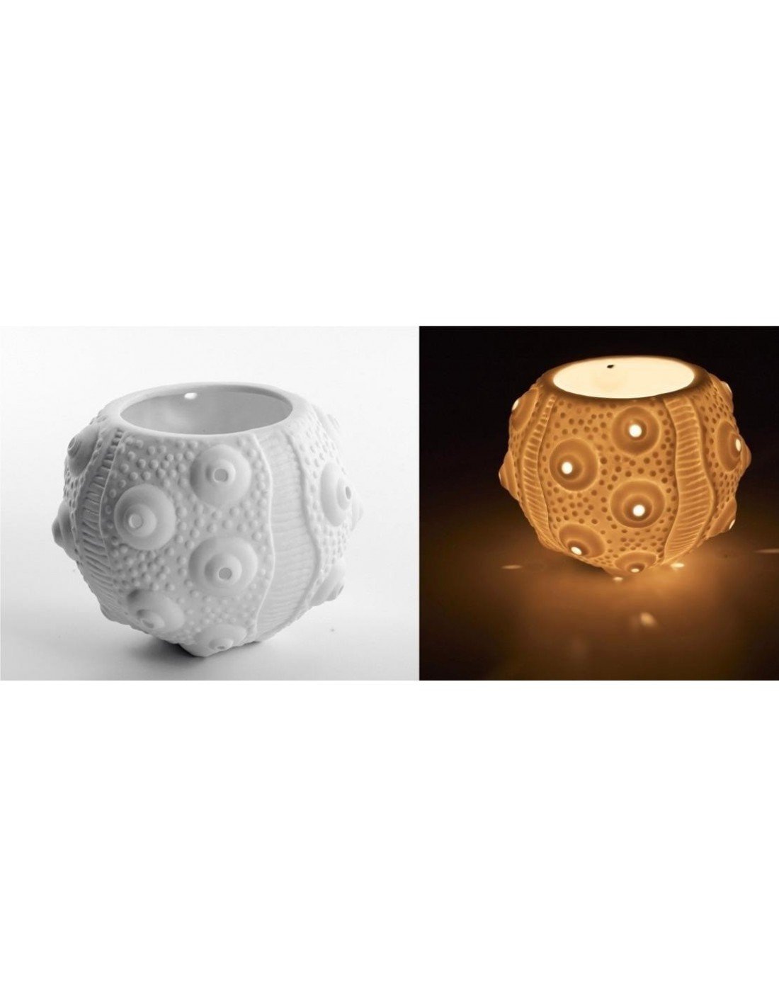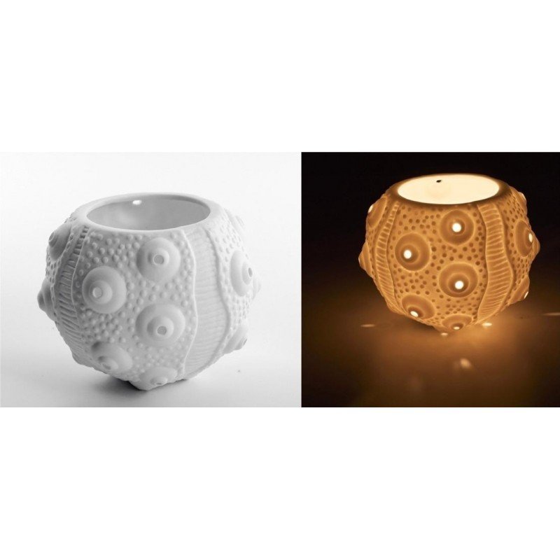 Iluminación marinera con porta velas náutico de Erizo de Mar hecho artesanalmente en porcelana blanca.