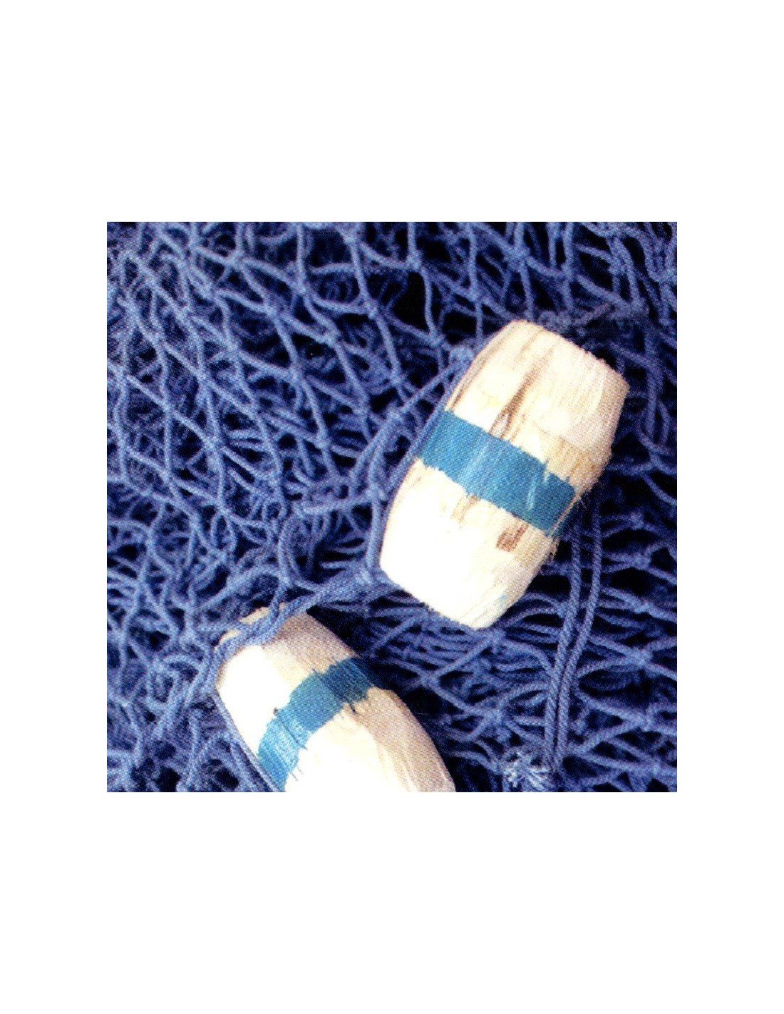 Red de pesca para decoraciones náuticas, elaborada en algodón de color azul y decorada con diez flotadores de madera sujetos con cáñamo.