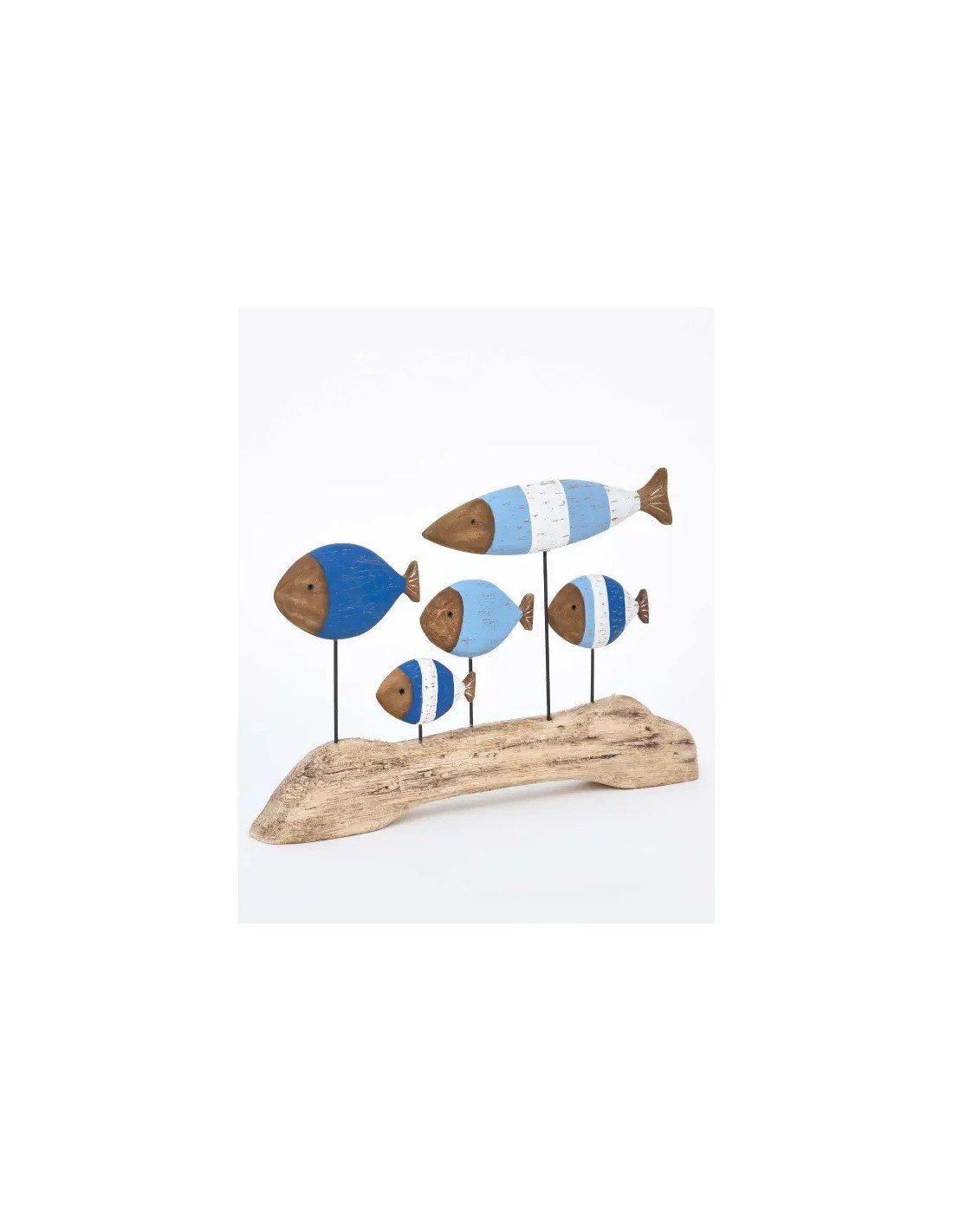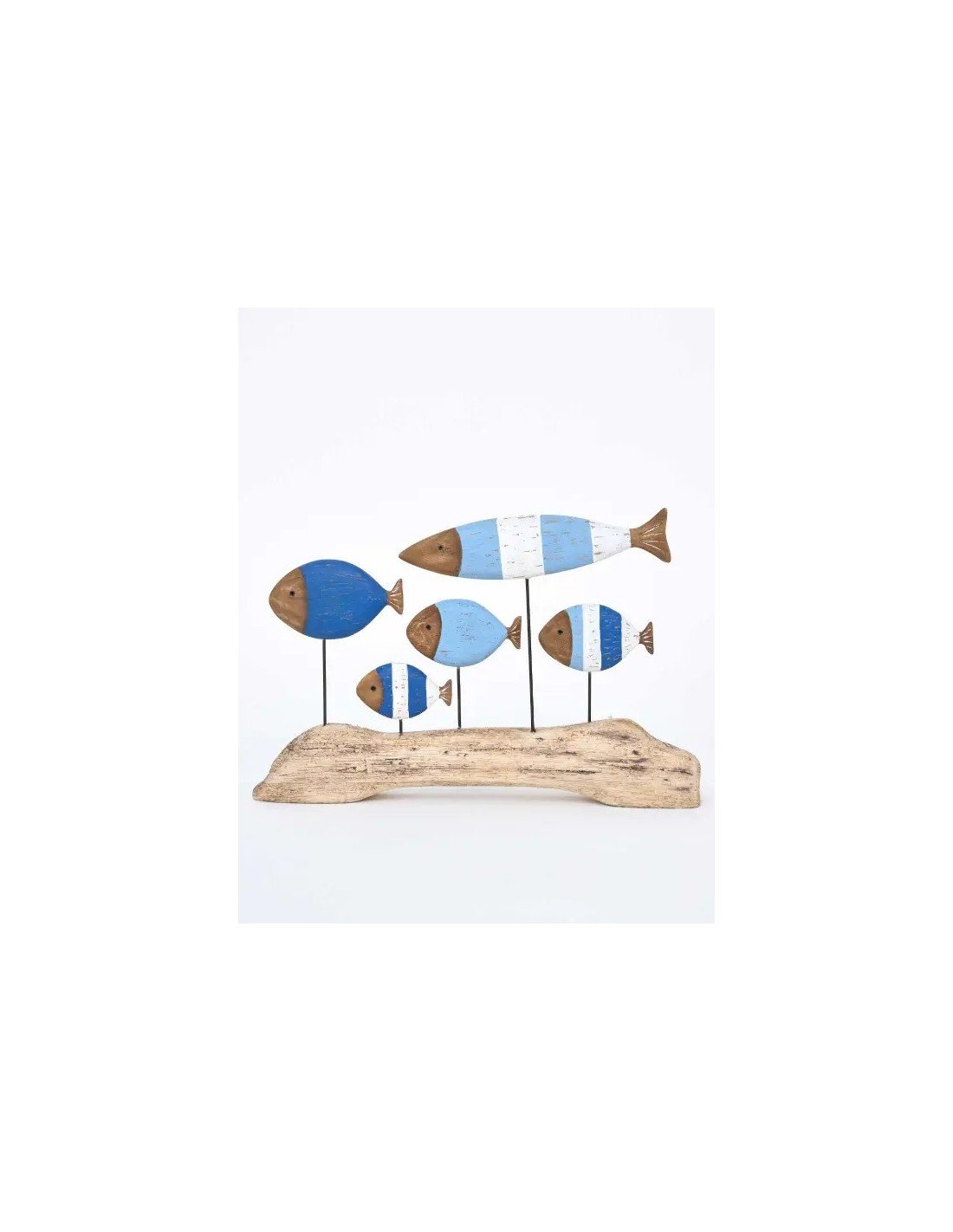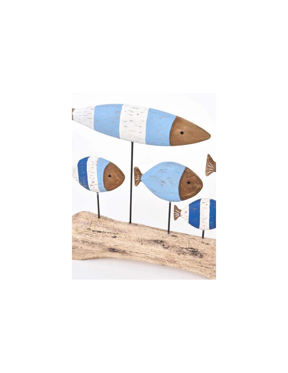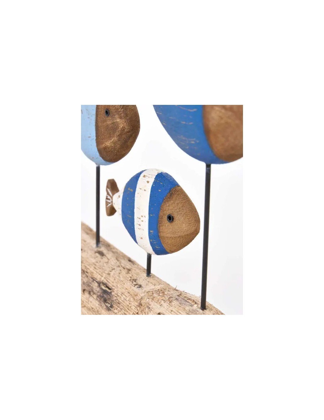 Los peces están pintados en tonos azul cielo, azul intenso y blanco con efecto desgastado, aportando contraste cromático suave. La base de madera aporta estabilidad y refuerza el carácter natural de la pieza.