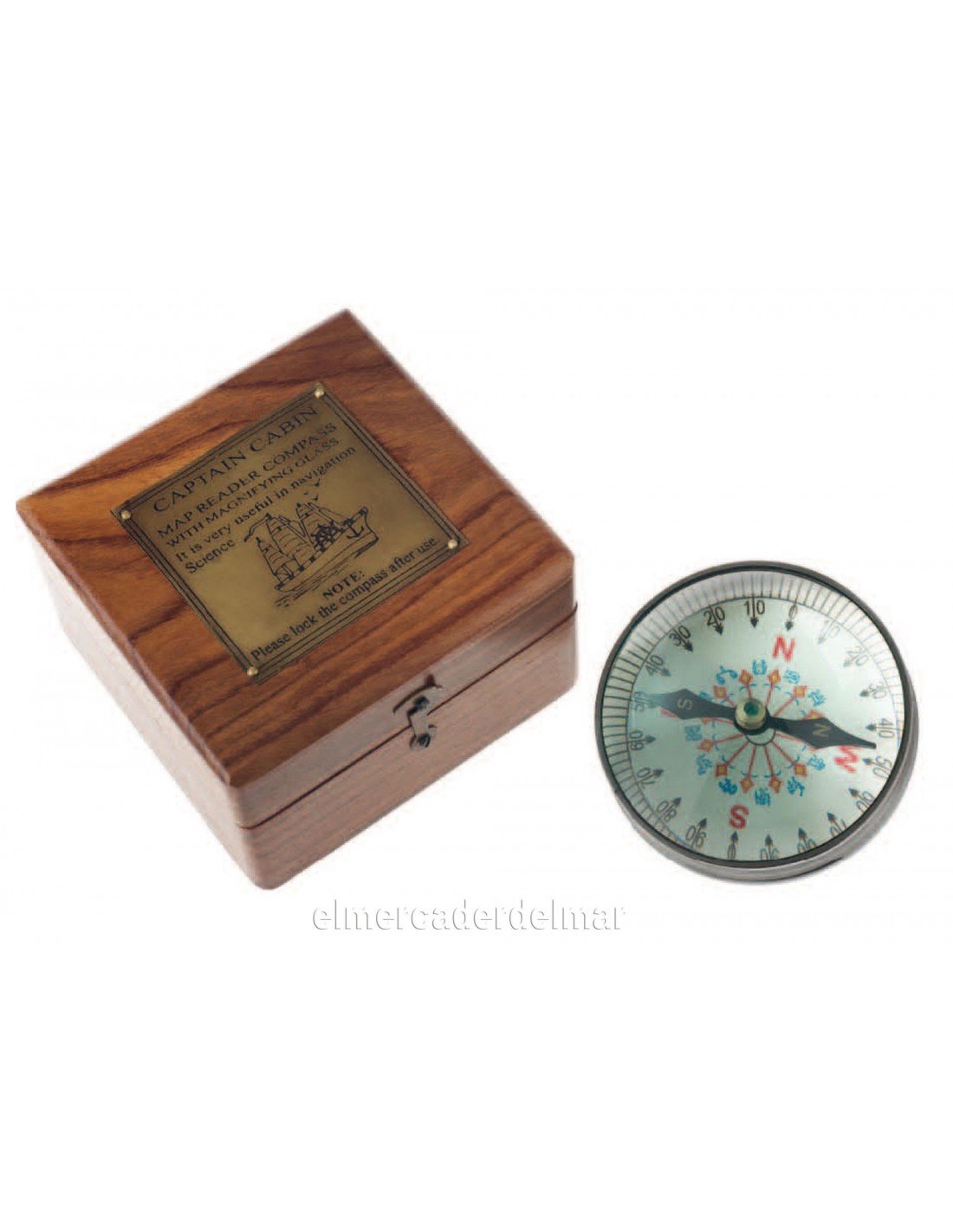 0Brújula con lente de aumento elaborado en latón envejecido y con cajita de madera de palisandro.