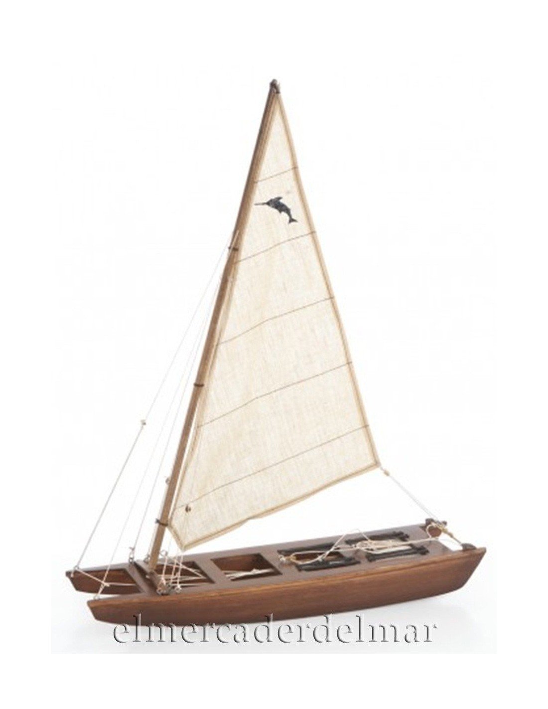 Maqueta naval montada en artesanía náutica elaborada en madera y aparejada con un solo mástil y vela triangular.
