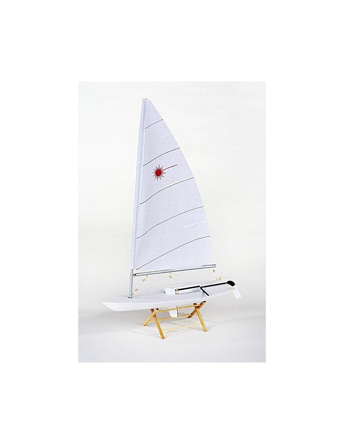 Modelismo naval de artesanía náutica del popular velero Láser elaborado en madera con peana.