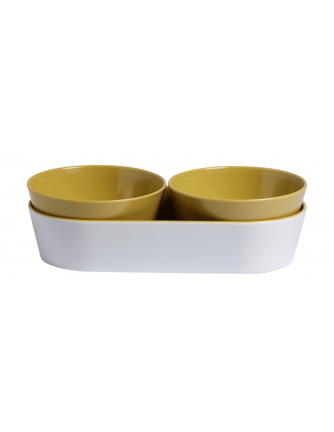 Set de 3 piezas náuticas mostaza de dos bols redondos pequeños que son ideales para servir aperitivos salados o dulces en reuniones y se acompañan de una bandeja que los mantiene juntos para facilitar su traslado, se encuentra pintado de blanco en la parte exterior y mostaza en el interior.