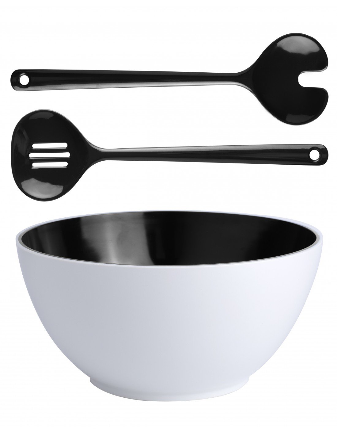 Set de 3 unidades de ensaladera y cubiertos pintadas de color negro y blanco que refleja elegancia combinando perfecto en el lugar donde lo sitúes. Elaboradas en material de melamina que resiste y perdura con el paso del tiempo.