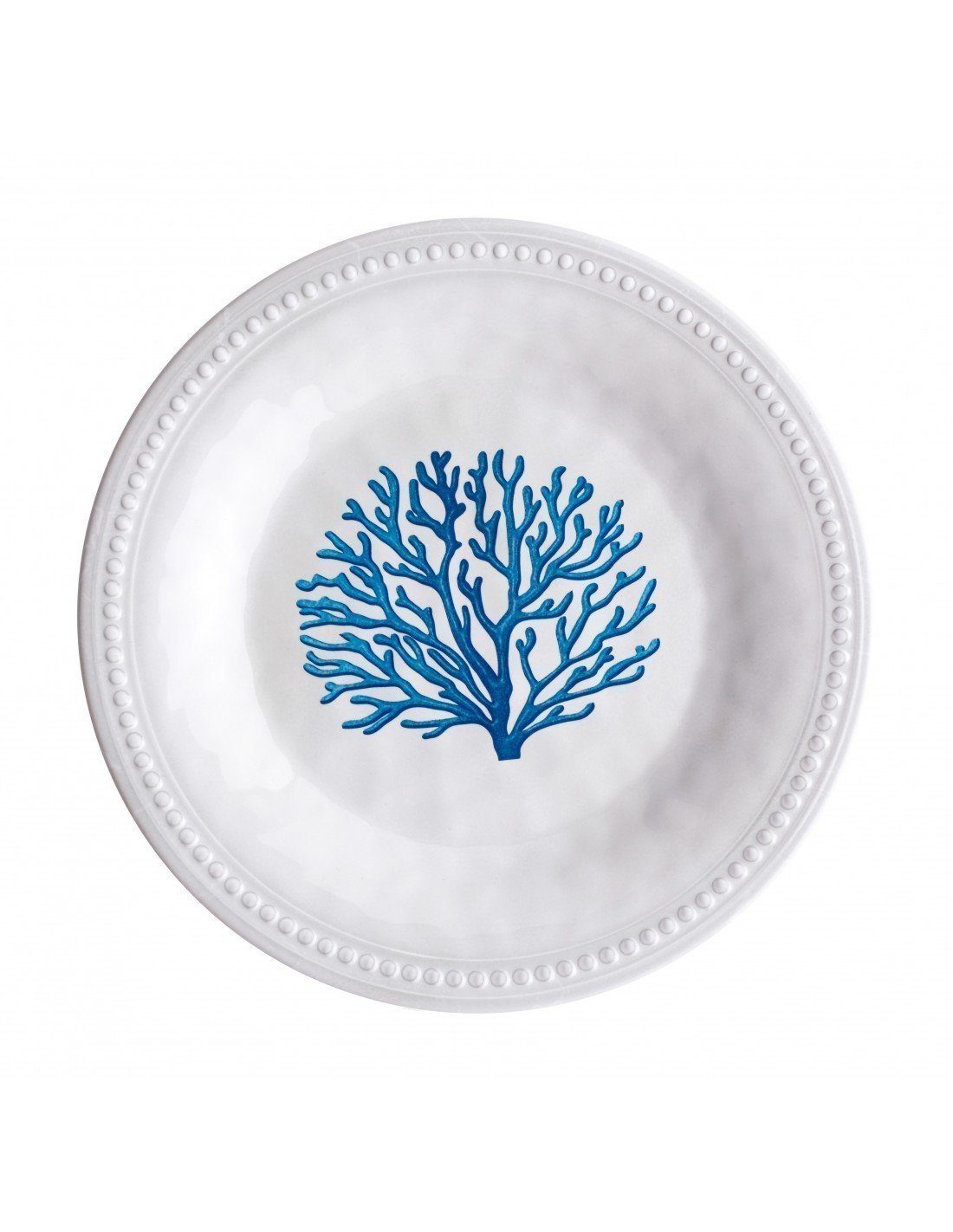 Juego de 6 unidades de platos para postre con forma redonda semi plata que tiene el tamaño perfecto para servir raciones de pasteles helados o calientes, se decora con un coral en el centro de colores marinos que resalta gracias a la base blanca del artículo.