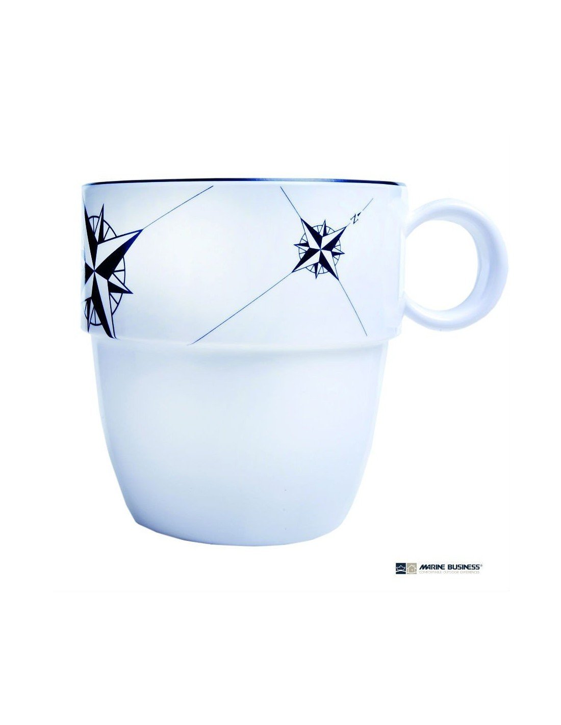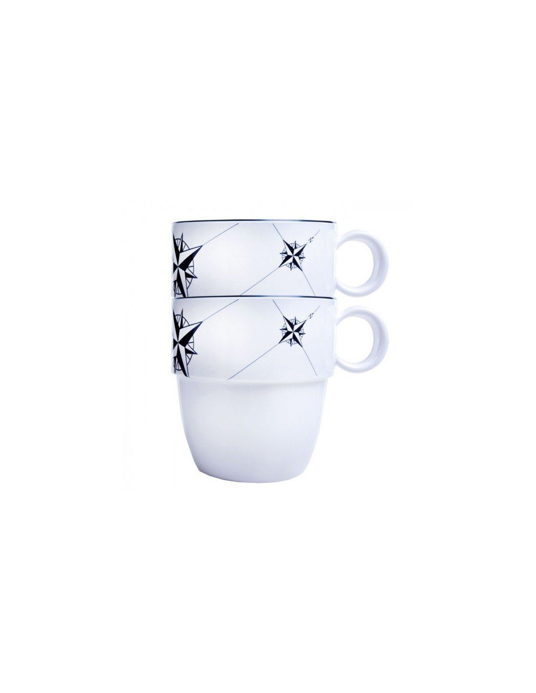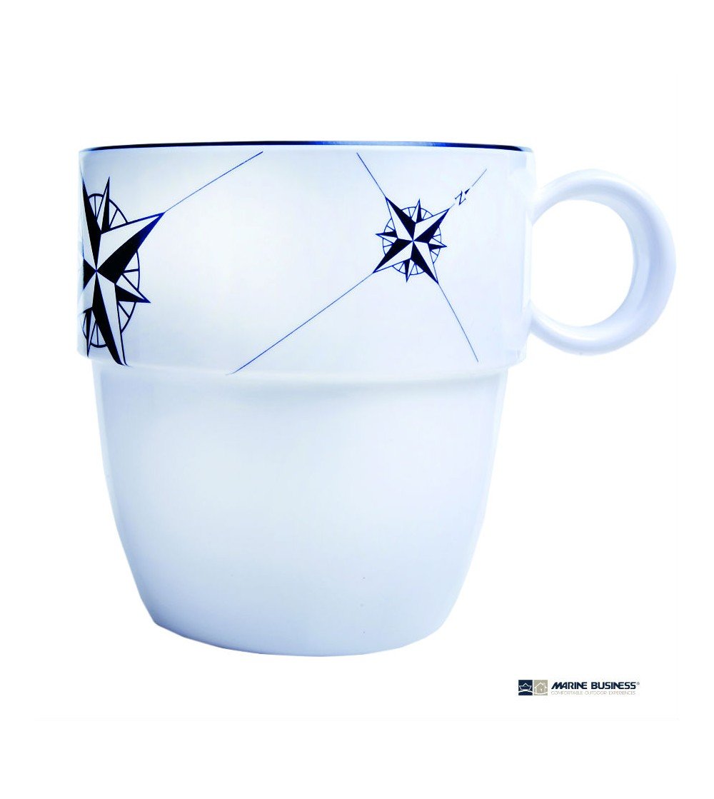 Juego de 6 tazas irrompibles y apilables, de resina de melamina de alta resistencia y elegante diseño náutico. Pose las tazas sin preocuparse por las caídas.