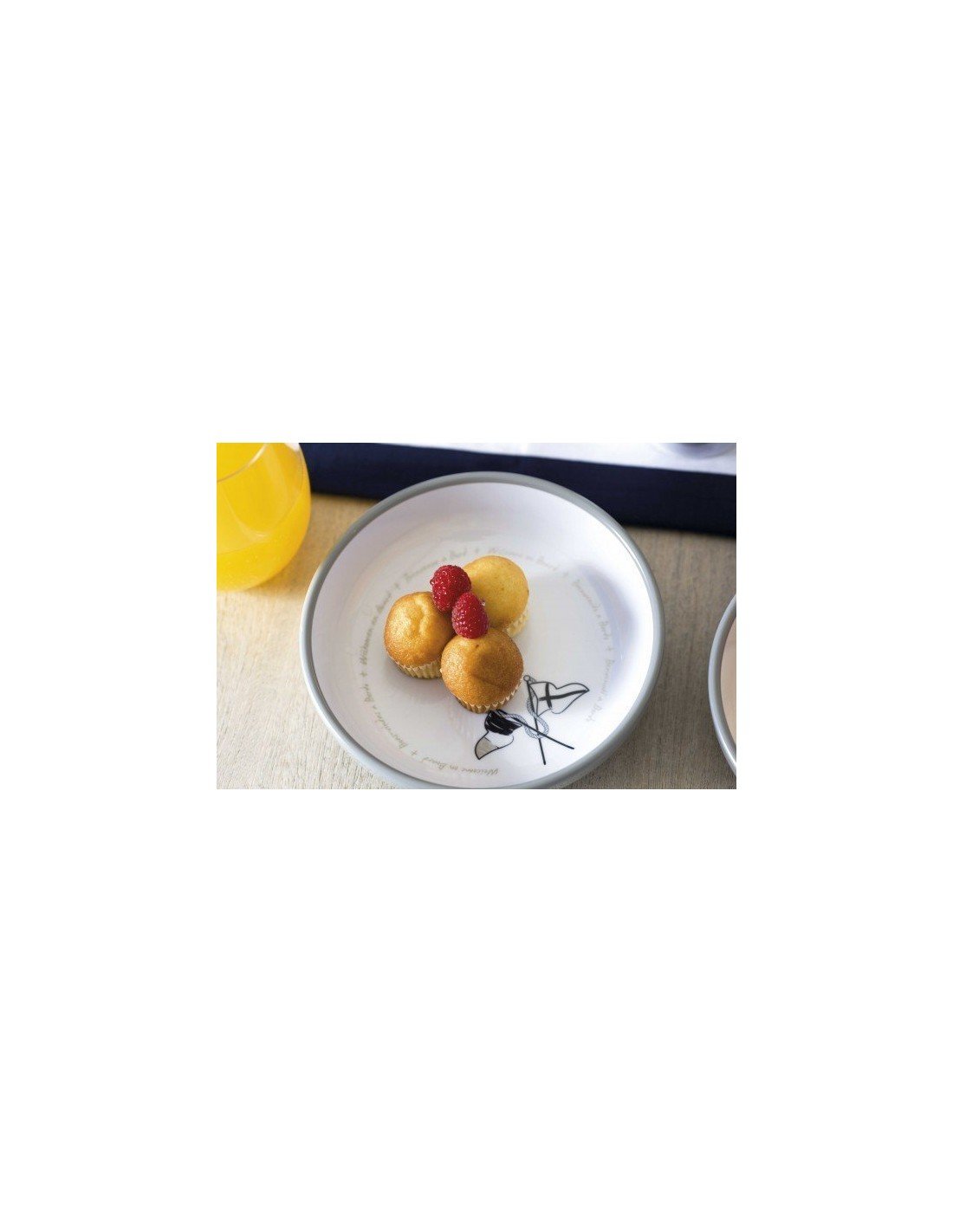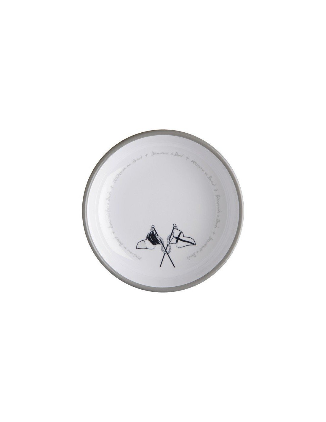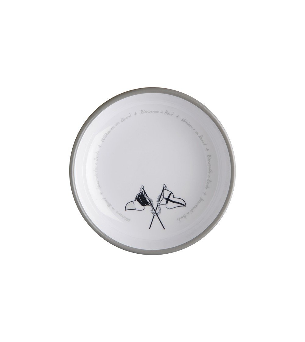 Set de 6 platos hondos náuticos fabricados con melamina antideslizante irrompible. De color blanco y gris, tienen la inscripción "Bienvenidos a bordo".