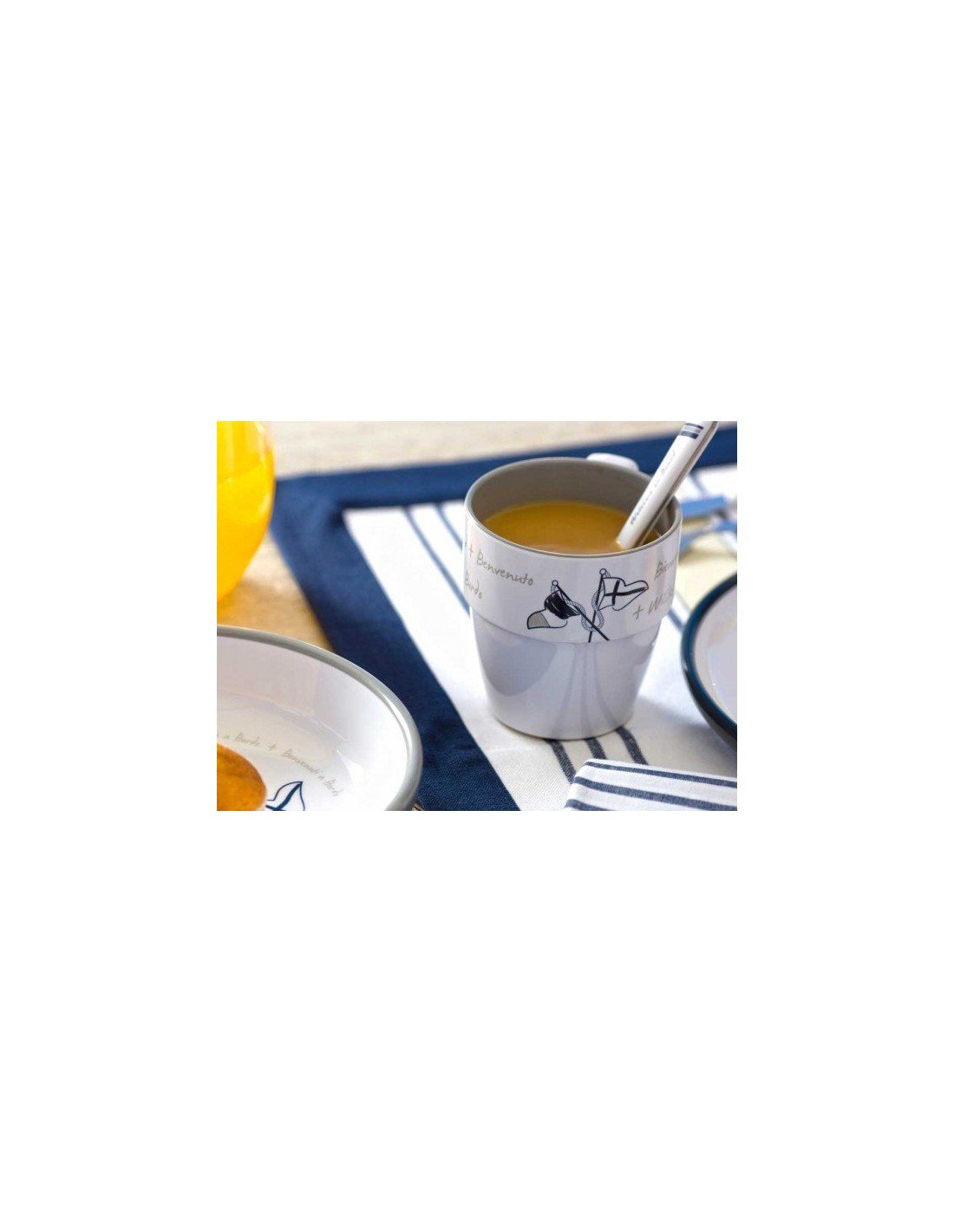 Estos platos de la colección Welcome On Board, soportan golpes y caídas. Aparte de estar fabricados con melamina, disponen de un aro de goma antideslizante en la parte inferior azul del plato. Ese es el motivo de que esta vajilla marinera sea irrompible y sean aptos para el lavavajillas. Son platos de gran tamaño y con el dibujo de dos banderas en la parte inferior: la bandera 2º repetidor y la bandera nº 8.